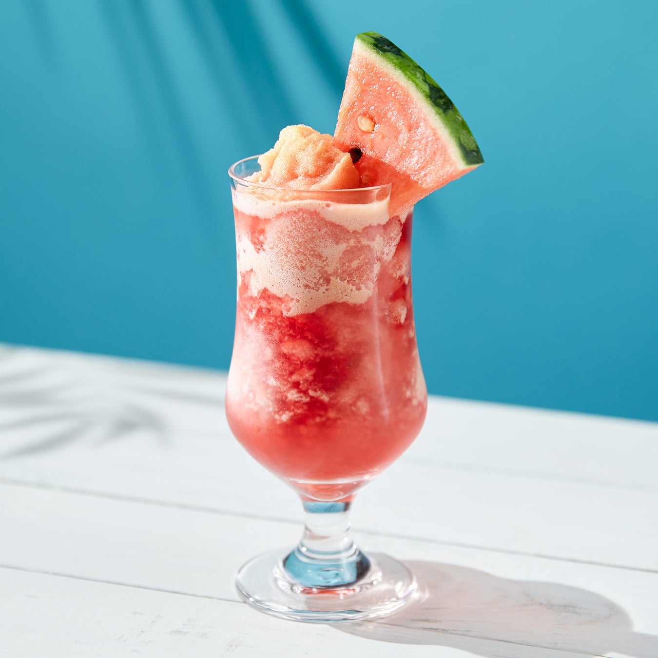 スイカの香りやハイビスカスのほんのりとした酸味、ビーツとローズヒップなどの味わいが重なるティバーナ™の夏の風物詩『トロピカルアドベンチャー』を使用した、まるで常夏のリゾートに訪れた気分にさせてくれる一杯。パッションフルーツやマンゴーなどのトロピカルフルーツを組み合わせた、見た目も味わいも楽しめる「ティバーナ™ フローズン」。
