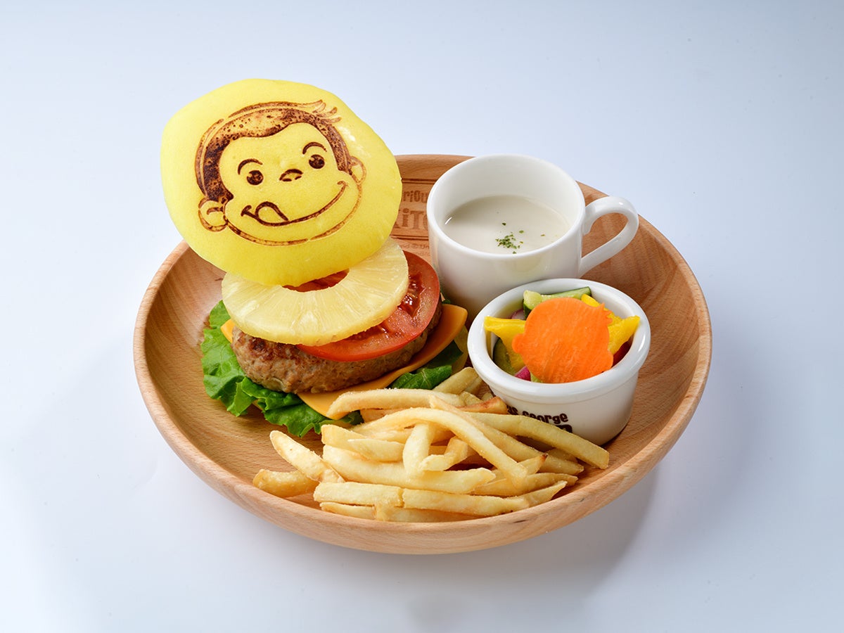 ジョージがすやすやとたまごのお布団で眠るオムライスとハンバーグのボリュームたっぷりなプレート「すやすやおやすみ☆「ジョージ」オムライス&ハンバーグプレート」や、にっこりと笑顔のジョージがかわいらしいバンズに、パイナップルやトマト、ジューシーなパテを挟んだ「にっこりえがおの♪パイナップルバーガープレート」、デザートには、かき氷でジョージが大好きな黄色い帽子のおじさんを作ってみた「黄色いぼうしのおじさん?いろどりフルーツのかき氷!」、ぷかぷかとうきわに乗ったジョージが涼し気なドリンク「うきわでぷかぷか!カラフルクリームソーダ(全3種)」など、ジョージの世界の魅力がたっぷり詰まったラインアップです。