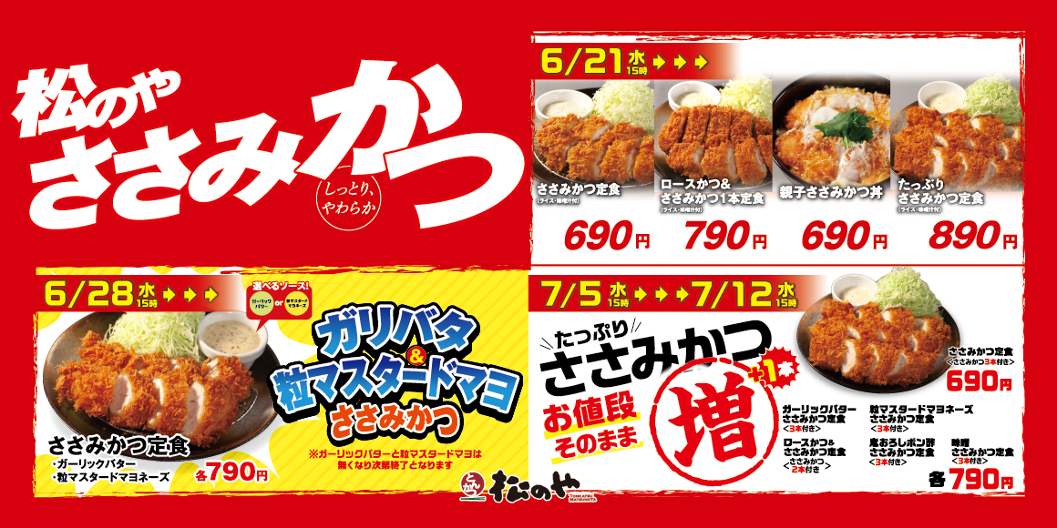 | 商品名 ささみかつ定食 690円 鬼おろしポン酢ささみかつ定食 790円 味噌ささみかつ定食 790円 たっぷりささみかつ定食 890円 ロースかつ&ささみかつ1本定食 790円 ロースかつ&ささみかつ2本定食 990円 ささみかつ&海老フライ1尾定食 960円 ささみかつ&海老フライ2尾定食 1,230円 親子ささみかつ丼 690円 ささみかつカレー 690円 単品ささみかつ 230円 ※全て税込価格です。また、店内・お持ち帰りの税込価格は同一です。 ※お持ち帰りいただけます。お持ち帰りのみそ汁は、別途60円でお買い求めいただけます。 ※「ささみかつカレー」にはみそ汁は付きません。 ※「ささみかつカレー」は「松のや・マイカリー食堂併設店舗」「松屋・松のや併設店舗」での販売はいたしません。 発売日 2023年6月21日(水)午後3時~ |