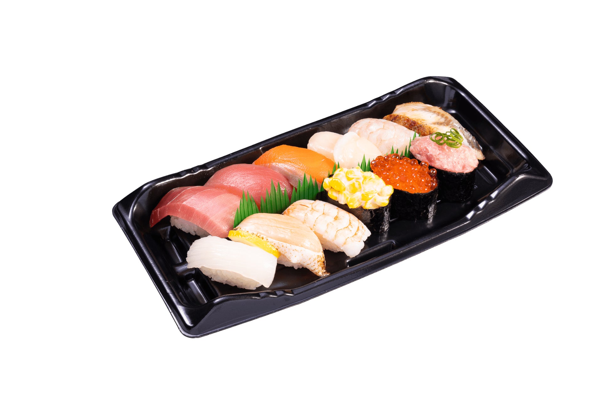 ・セット内容:中とろ、まぐろ、サーモン、ほたて、生えび、うなぎ、真いか、焼きサーモン、えび、