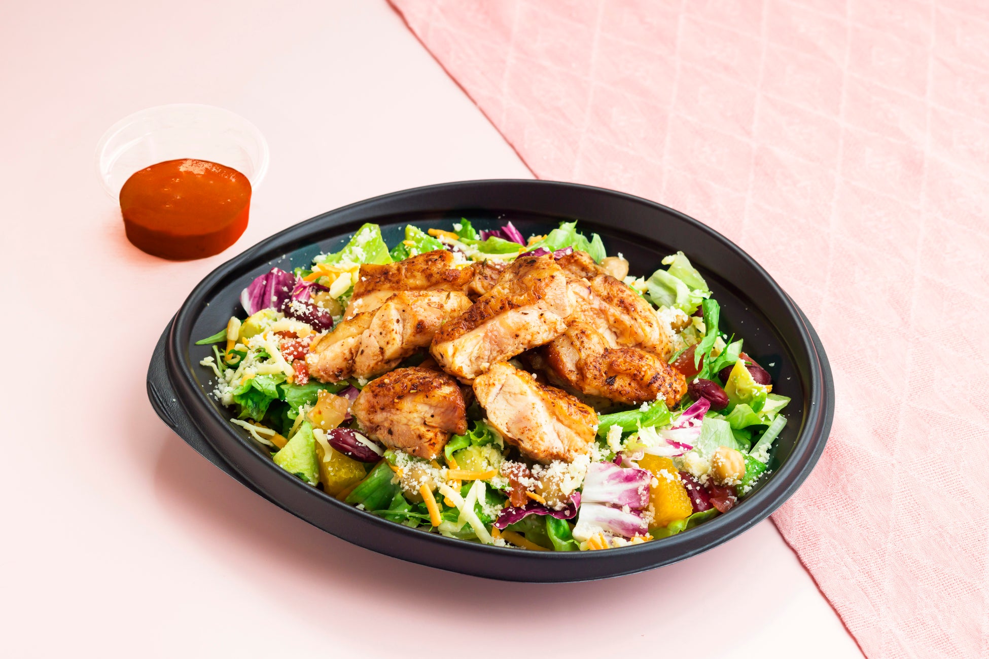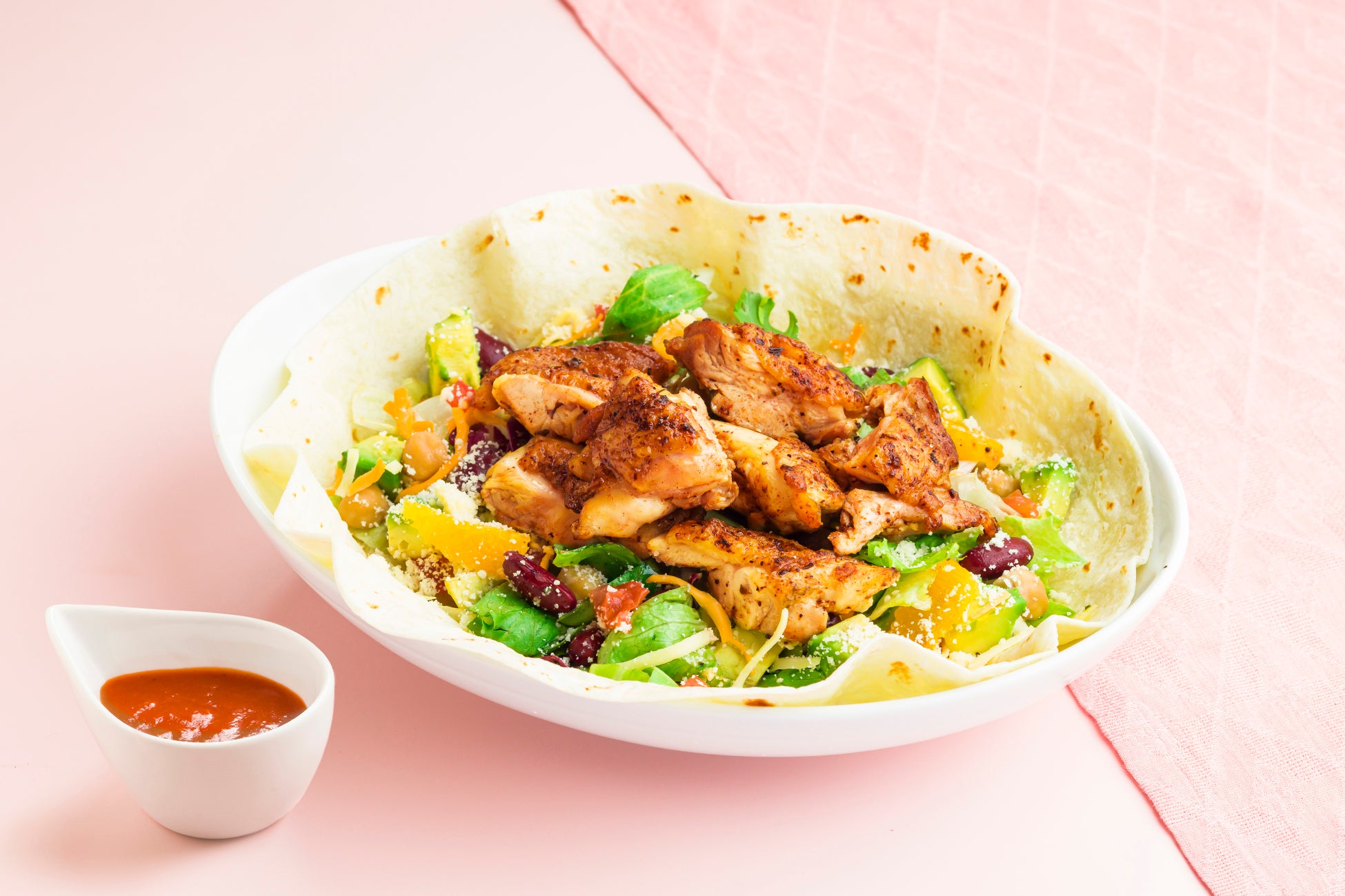 トルティーヤにアボカドやオレンジ、ライスなど12種類の食材とスパイスの効いたケイジャンチキンをのせたパワーサラダ。ピリ辛のメキシカンタコソースと混ぜてお召し上がりください。