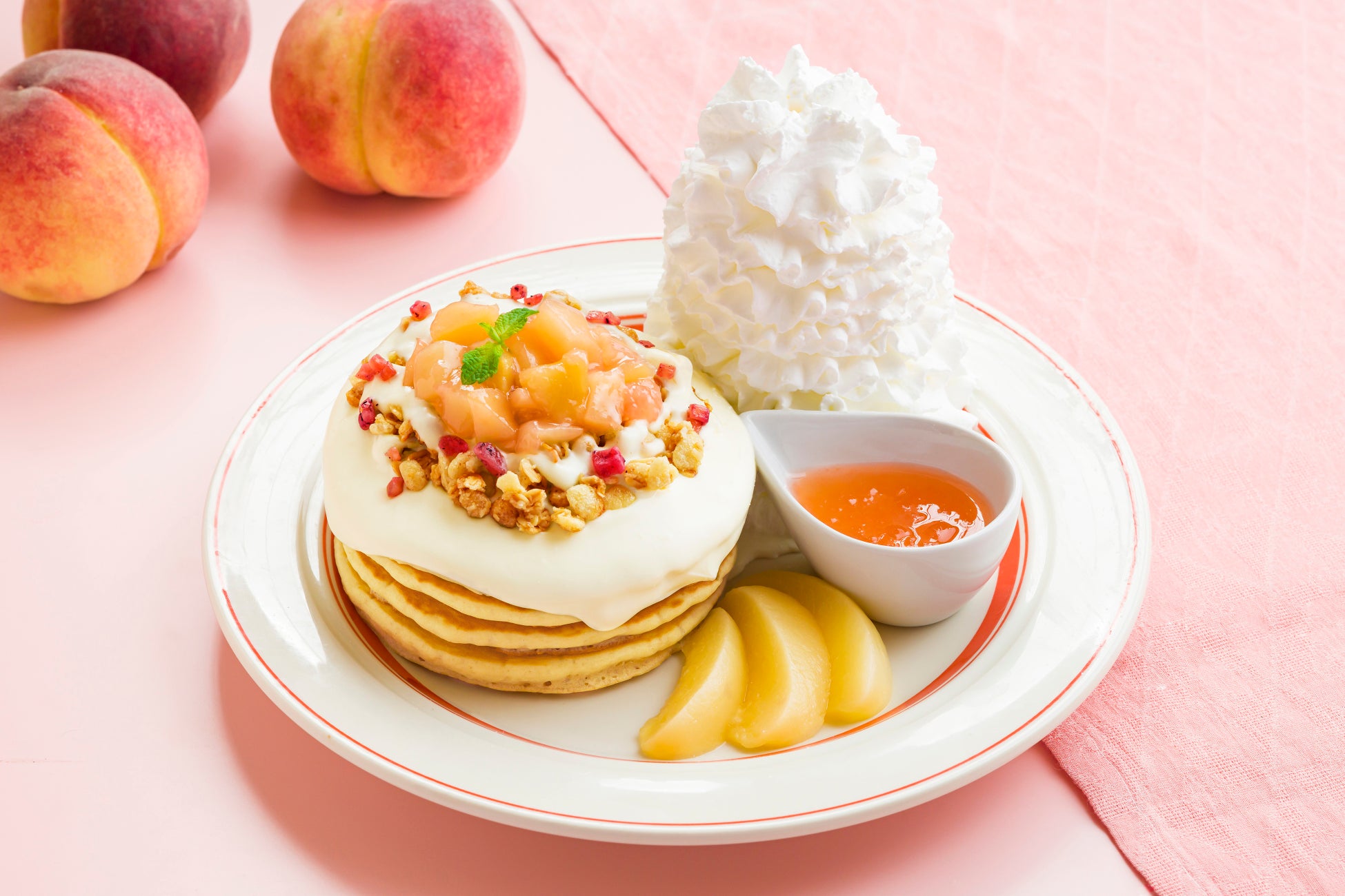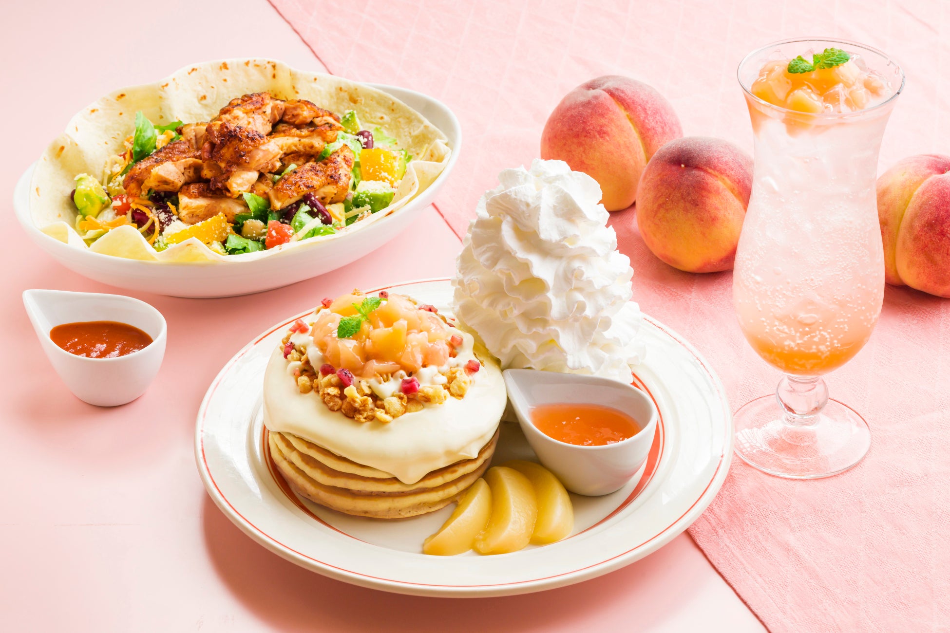【Eggs ’n Things】爽やかな旬の桃を楽しめるメニューが登場!「白桃のパンケーキ」「ケイジャンチキンサラダ」7月1日(土)~7月31日(月)まで販売