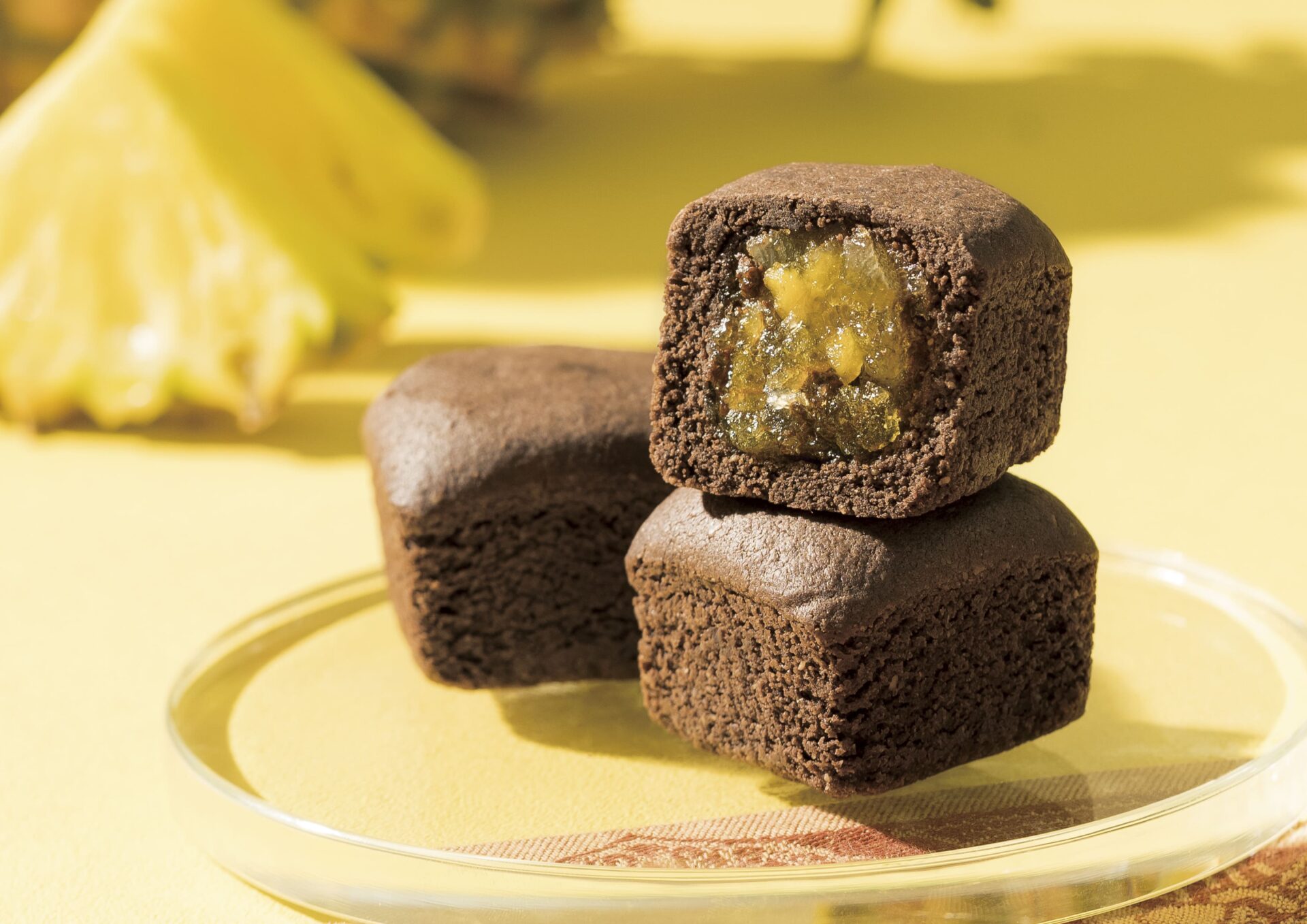 シャキッとした食感が楽しい甘酸っぱいパイナップルフィリングに、ベルギー産のカカオ分50%のチョコレートチップを加え、ブラックココアを混ぜたほろ苦いさっくりとした生地で包みました。ドライパイナップルとドライマンゴーを入れることで食感のあるフィリングとなり、そのフルーティーさもお楽しみいただけます。