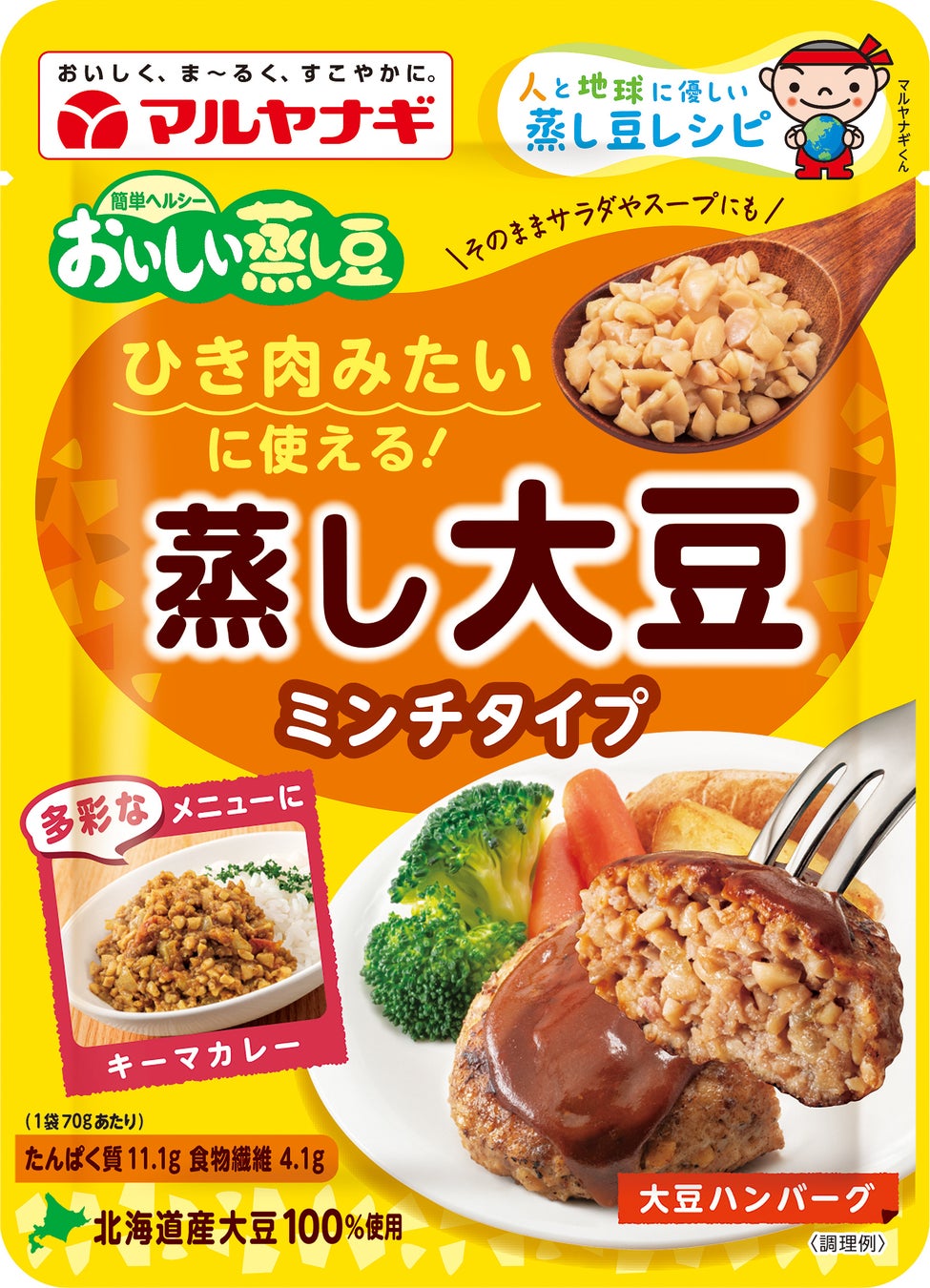 【ひき肉みたいに使える蒸し大豆商品ページ】https://www.maruyanagi.co.jp/products/hikiniku-mushidaizu/