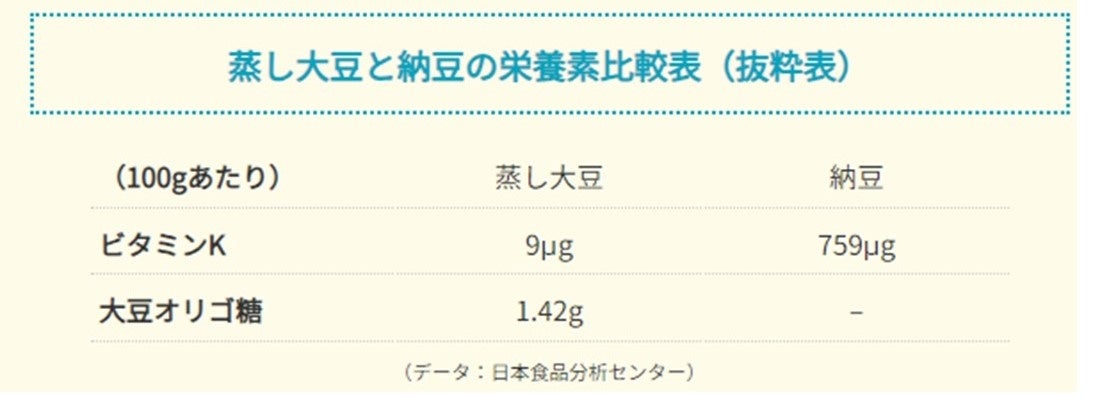 「蒸し大豆」と「納豆」が栄養面で大きく異なるのは次の2つです。納豆には発酵する際に生成される「ビタミンK」が蒸し大豆に比べ多く含まれています。一方で「大豆オリゴ糖」は、発酵する際に納豆菌が分解してしまうため、納豆からは失われてしまいます。