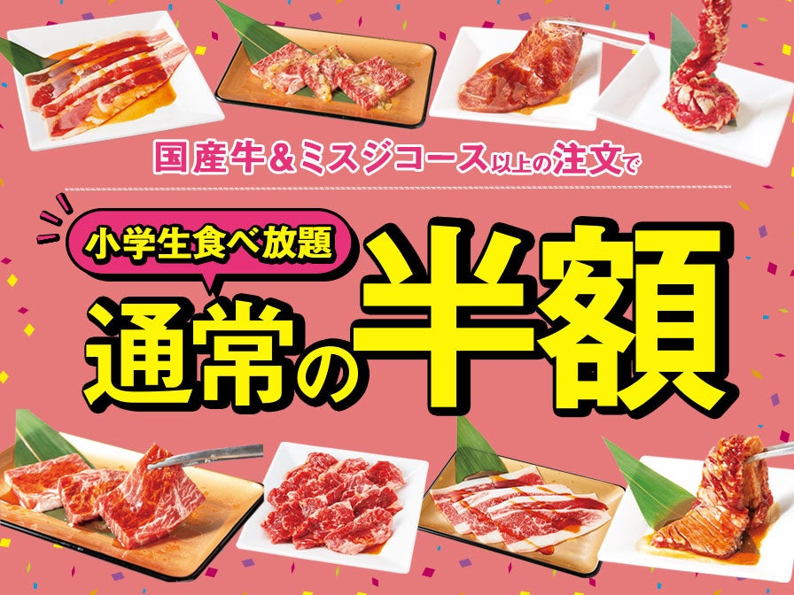 期間中にご来店頂き、「国産牛&ミスジコース」または「フルコース」をご注文して頂くと、小学生食べ放題が通常料金からさらに半額となります。