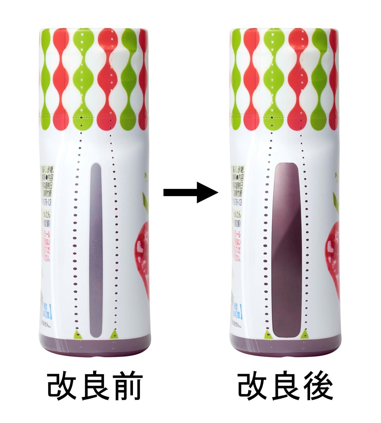 ・ボトル容器を柔らかくしたことで、従来品と比較して約8割の力で中身を出せるようになりました(当社比)。さらに残量がひと目で分かるよう、容器側面の窓を大きくし、透明度を上げました。