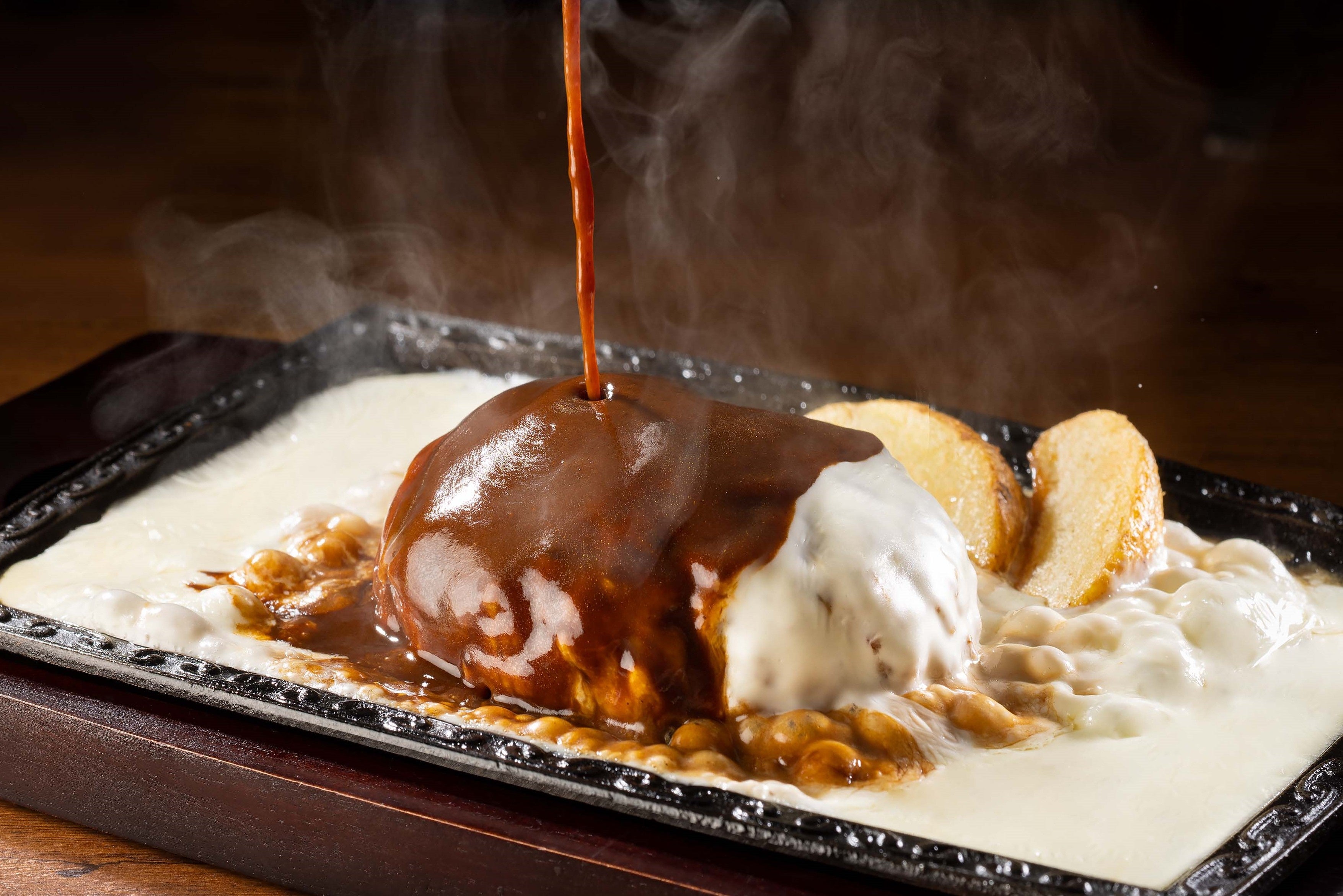 “アツアツ鉄板にジュワっとたっぷりソースがお肉を包む映えバーグ”