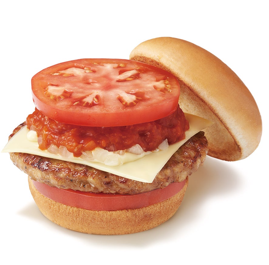 『デラックスモスバーガー ダブルトマト』にスライスチーズを加えました。ふっくらとしたハンバーグと自慢のミートソースにチーズが絶妙に絡み合い、濃厚かつまろやかな味わいが楽しめます。