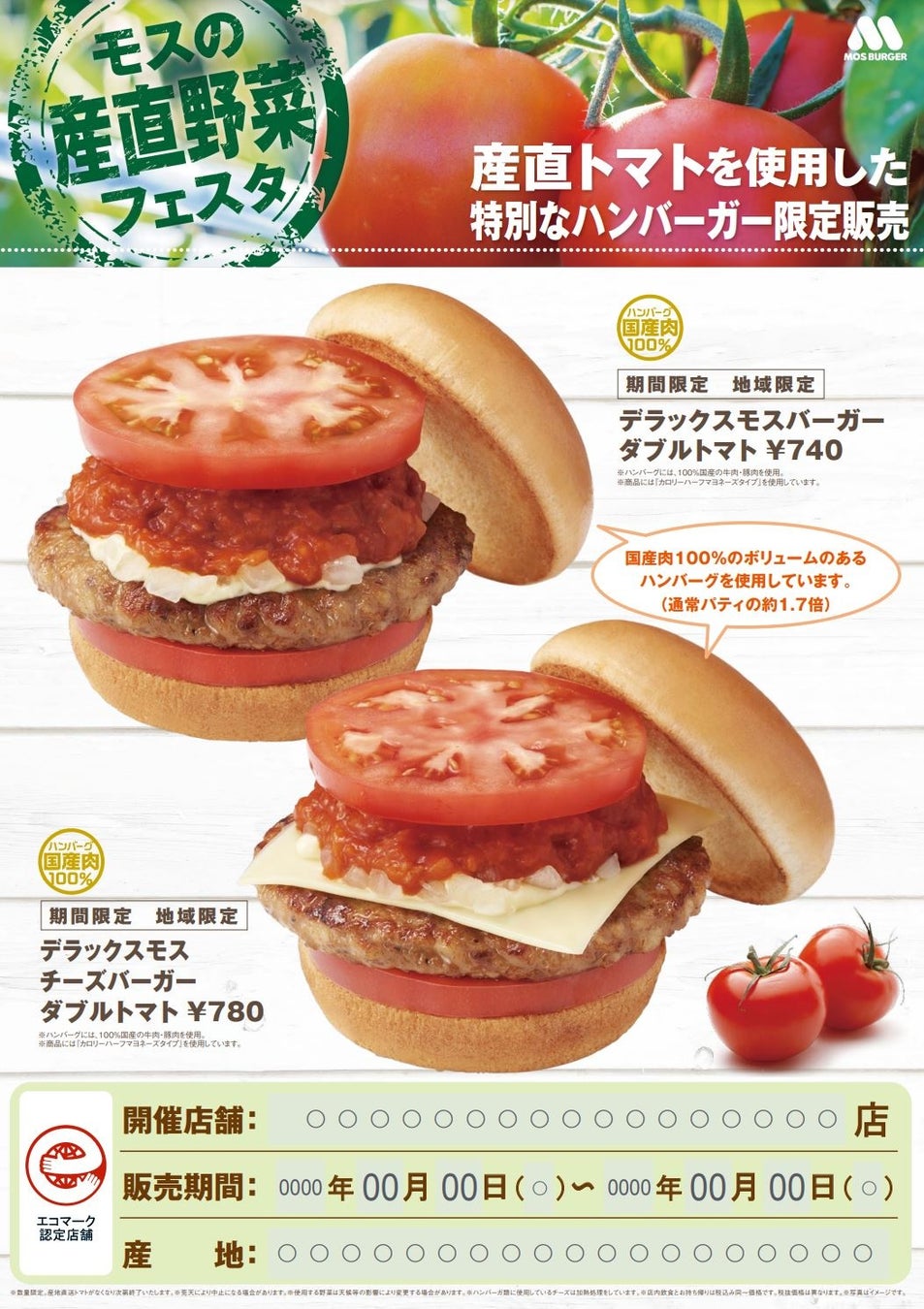 期間中は、同部会の産地直送トマトを使用した地域・期間限定商品「デラックスモスバーガー ダブルトマト」と「デラックスモスチーズバーガー ダブルトマト」を販売します。秋田県鹿角市産地直送のトマトを使った、この期間だけのジューシーでボリュームたっぷりのハンバーガーを、ぜひお召し上がりください。さらに、素材のおいしさをそのまま味わっていただけるよう、収穫されたトマトを、お持ち帰り限定で販売します※。(1個:200円 /数量限定 なくなり次第終了します。)
