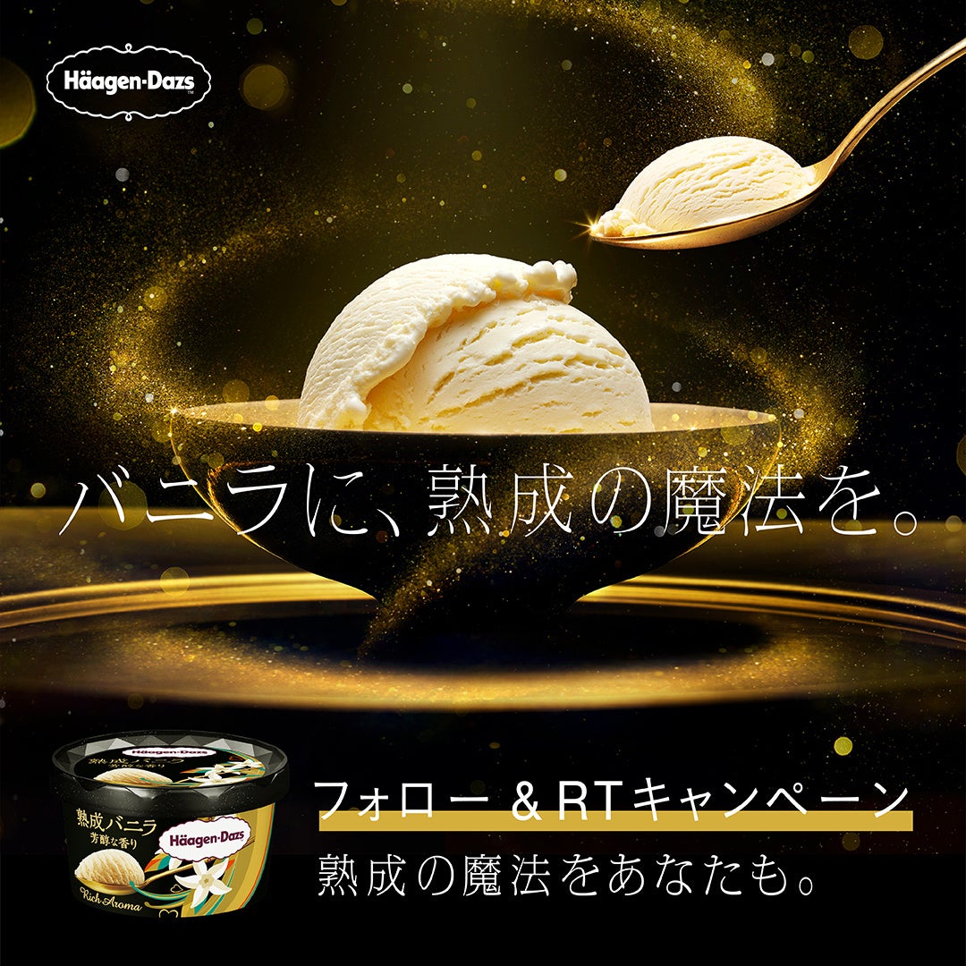 『熟成バニラ 芳醇な香り』の発売を記念して、15名様に、『熟成バニラ 芳醇な香り』を含むハーゲンダッツ「12個詰め合わせセット」が当たるキャンペーンを、Twitterで実施します。<キャンペーン概要>