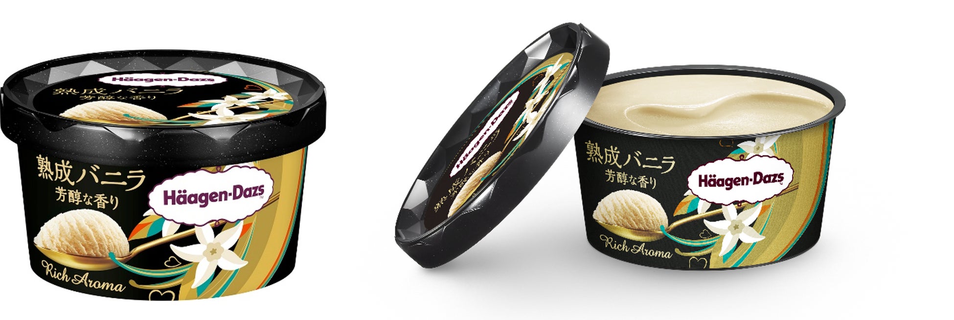 本商品は、ハーゲンダッツこだわりのバニラエキスを熟成させることで、上質な香りを存分に堪能できる、この夏限定の特別なバニラアイスクリームです。パッケージデザインは、ブラックとゴールドを使用することで、洗練された大人な世界観を表現しました。また、さりげなくハートをしのばせたデザインで幸福感も表現しています。日常を贅沢に彩る熟成したバニラの芳醇な香りの体験を通じて、至福のひとときをお届けします。