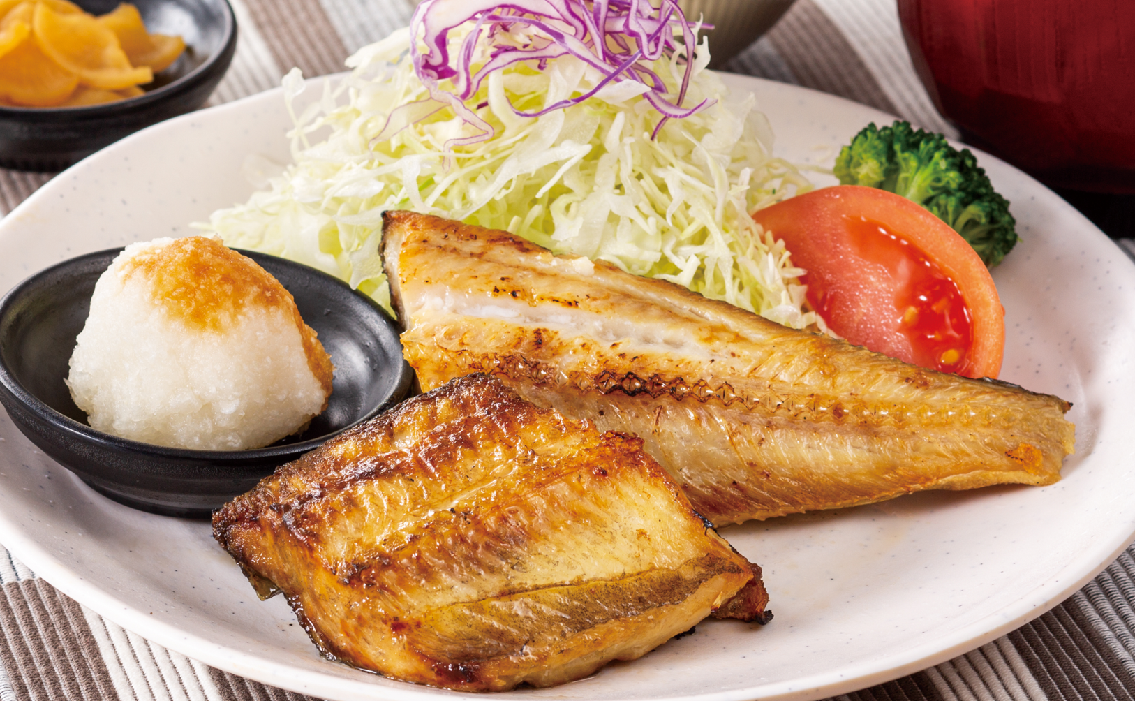 皮はパリッと身はふっくらジューシー、脂ののったほっけを直火でじっくり焼いた大戸屋こだわりの魚定食。健康志向の方やダイエット中の方にも嬉しいメニュー。おろしたての大根おろしでさっぱりと。