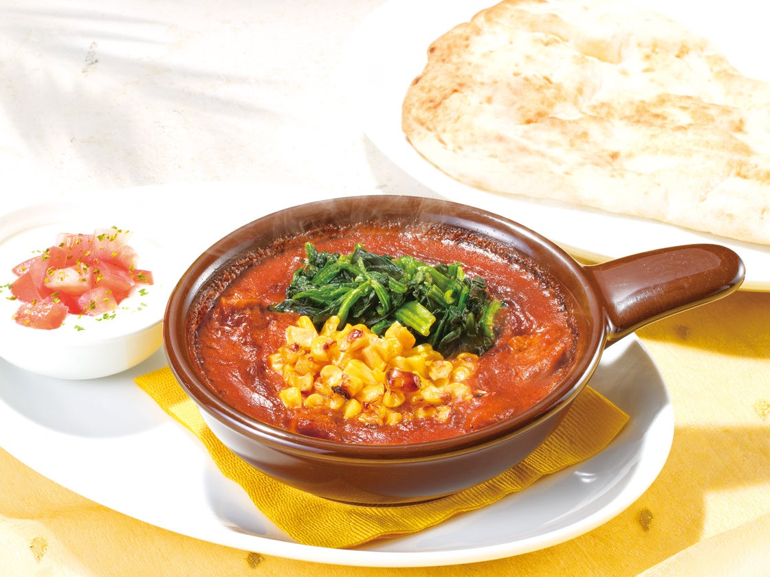 生クリームとバター、ナッツのコクがトマトの酸味を引き立てるルーでチキンと玉ねぎを煮込み、ほうれん草と夏に旬を迎えるコーンをトッピングしました。仕上げにオーブンで熱々に焼き上げることで、味に深みを出したこだわりのバターチキンカレーです。