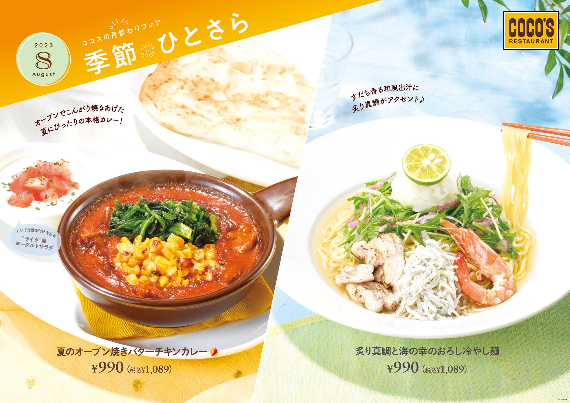 株式会社ココスジャパン(代表取締役社長:一木 直哉 本社:東京都港区)が全国に展開するファミリーレストラン「ココス」では8月1日(火)より、「季節のひとさら~8月~」として、ココスの夏の定番“カレー”と“冷やし麺”に新商品が登場します。