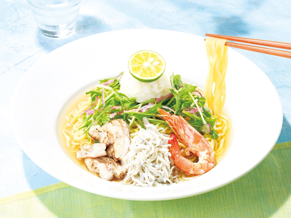 コシのある冷やし麺に、昆布とかつおの旨みにすだちの香りがアクセントとなる夏らしい出汁を組み合わせました。具材は、店内で炙った香ばしい風味の炙り真鯛と程よい塩味の釜あげしらす、豪華な見た目の有頭海老など、たっぷりの海の幸をトッピング。さらに、フレッシュな野菜と大根おろし、すだちを添えることで、さっぱりとお召し上がりいただける一品に仕上げました。すだちのグリーンや海老のレッドで、彩りも豊かな一品です。