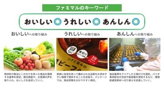 ファミマルのコンセプトは「ファミリークオリティ」。目指すのは大切な家族に安心してお薦めできる品質と安全性です。また、「おいしい◎うれしい◎あんしん◎」をキーワードに、お子さまからご高齢の方まで、誰にでもわかりやすい伝え方で、魅力を発信してまいります。