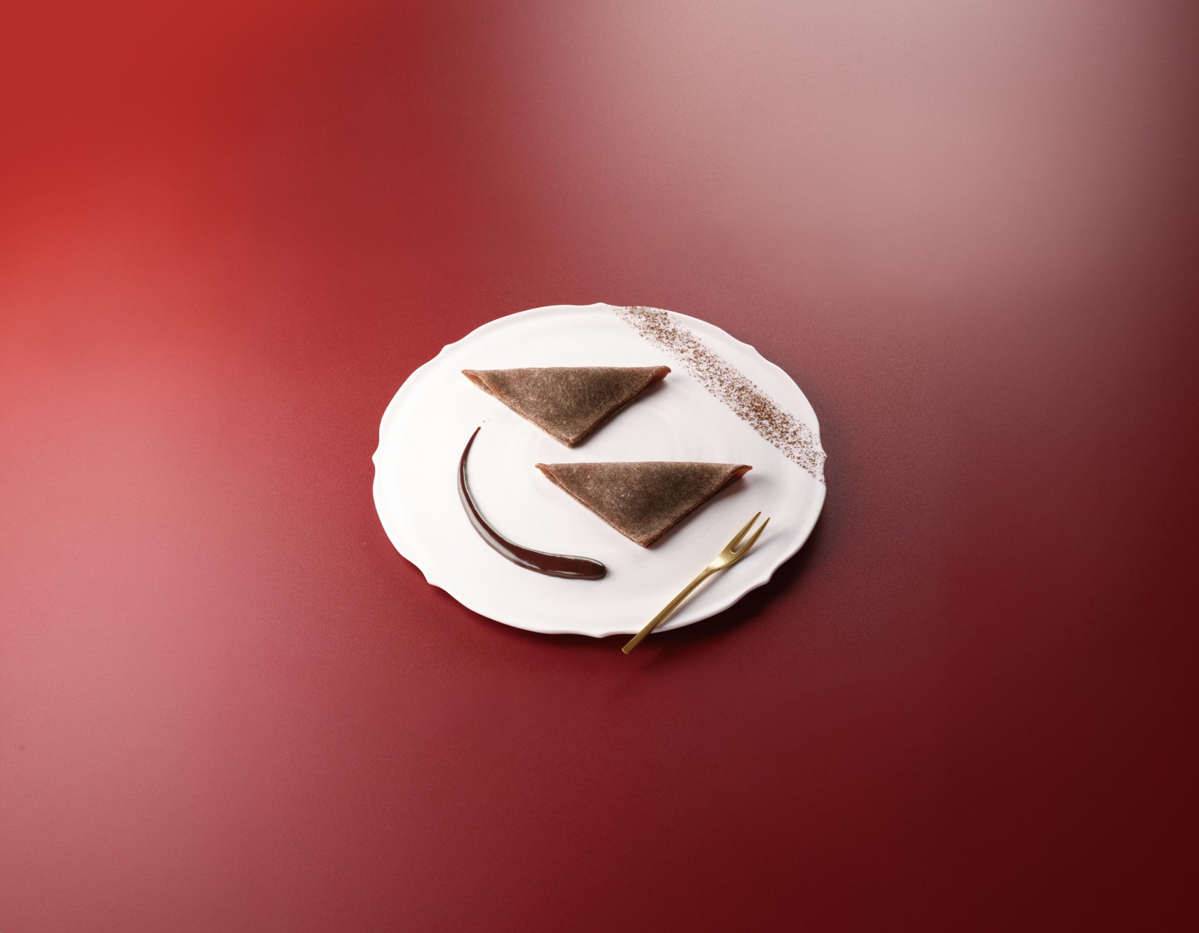 2種類のクーベルチュールチョコレートと純生クリームをあわせた口溶けなめらかなガナッシュ仕立てのチョコレートを、ココア風味の生八つ橋で包みました。2種類のクーベルチュールチョコレートをあわせる事で、カカオの風味と甘さのバランスを整えました。上品なチョコレートの味わいが口の中に広がります。