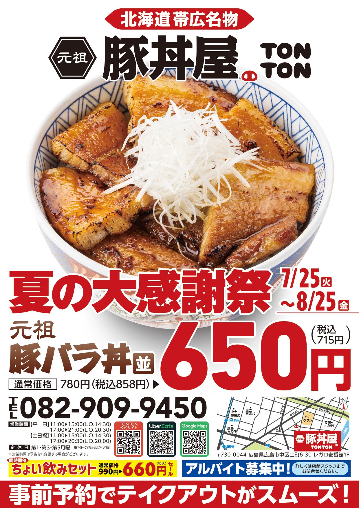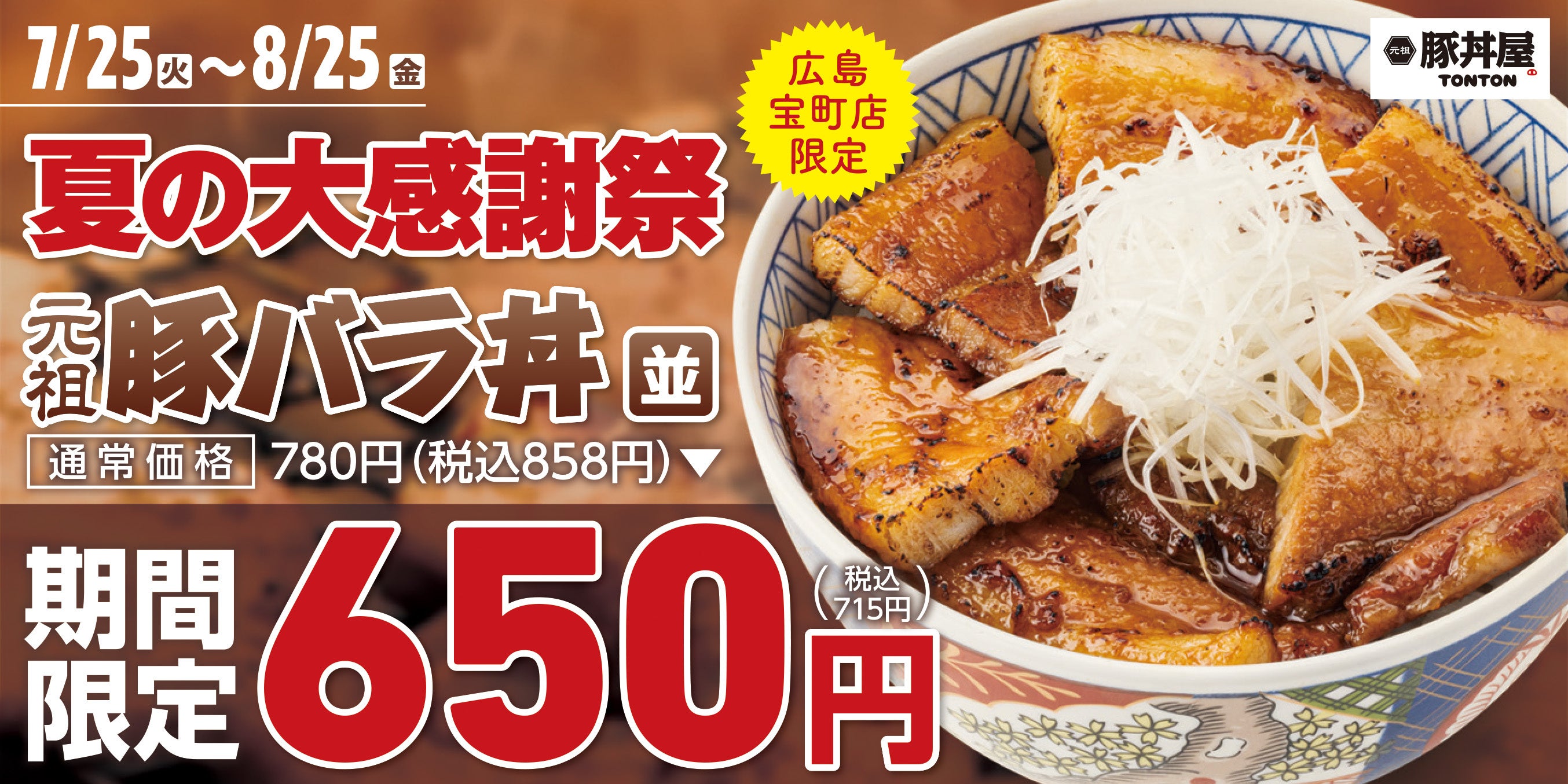 ボリュームたっぷりの北海道・帯広豚丼が人気の「元祖豚丼屋TONTON 広島宝町店」(住所:広島県広島市中区宝町6-30、TEL:082-909-9450)で、7月25日(火)〜8月25日(金)の期間中“夏の大感謝祭”を実施、「豚バラ丼【並】」を期間限定価格650円(税込715円)で提供いたします。
