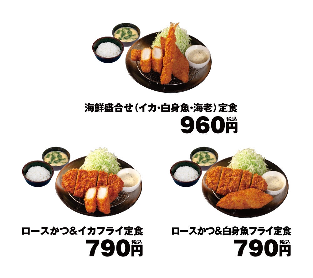 | 商品名 海鮮盛合せ定食(イカ・白身魚・海老) 960円 ロースかつ&イカフライ定食 790円 ロースかつ&白身魚フライ定食 790円 イカフライ単品 250円 白身魚フライ単品 250円 ※全て税込価格です。また、店内・お持ち帰りの税込価格は同一です。 ※お持ち帰りいただけます。お持ち帰りのみそ汁は、別途60円でお買い求めいただけます。 ※株主優待券ご使用いただけます。(単品は除きます。) 発売日 2023年8月2日(水)午後3時~ 対象店舗 一部店舗を除く全国の松のや ※沖縄店舗、高速PA店舗では販売いたしません。 |