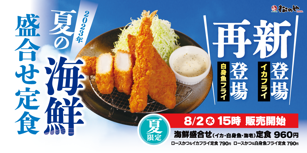 株式会社松屋フーズ(本社:東京都武蔵野市、代表取締役社長:瓦葺 一利)では、とんかつ専門店の「松のや」におきまして、2023年8月2日(水)午後3時より、「イカフライ・白身魚フライ」を発売いたします。