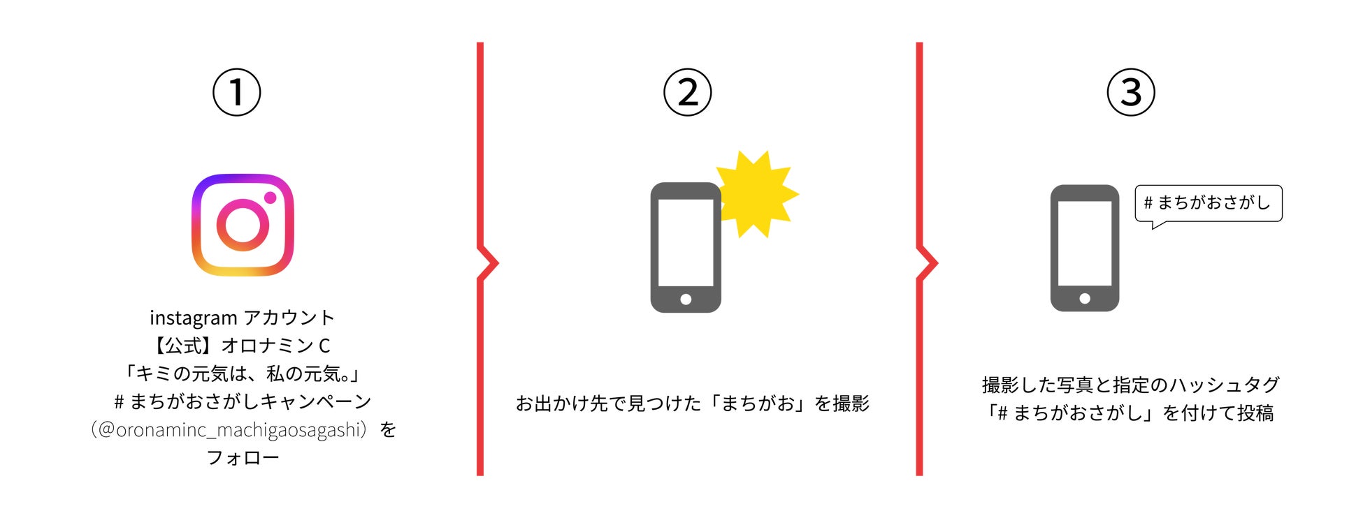参加方法   :Instagramにて、キャンペーン公式アカウントをフォローの上ハッシュタグ「#まちがおさがし」をつけて街で見つけた「まちがお」写真を投稿。