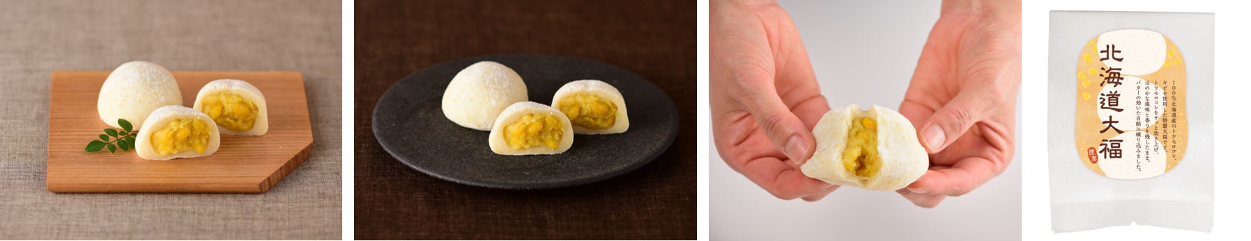 そしてこのたび、北海道産地直送センターでは、北海道美瑛町産のとうもろこしの粒と北海道産とうもろこしのペーストを白餡に練りこんだ、ほのかな塩味とやさしい甘みのバランスが絶妙な和菓子「北海道大福」を新発売 いたします。北海道産とうもろこしのおいしさをいつでも感じていただきたいという想いから、常日頃から素材を吟味し続けてきた北海道産地直送センターが3年の月日をかけて自社開発した初の商品です。