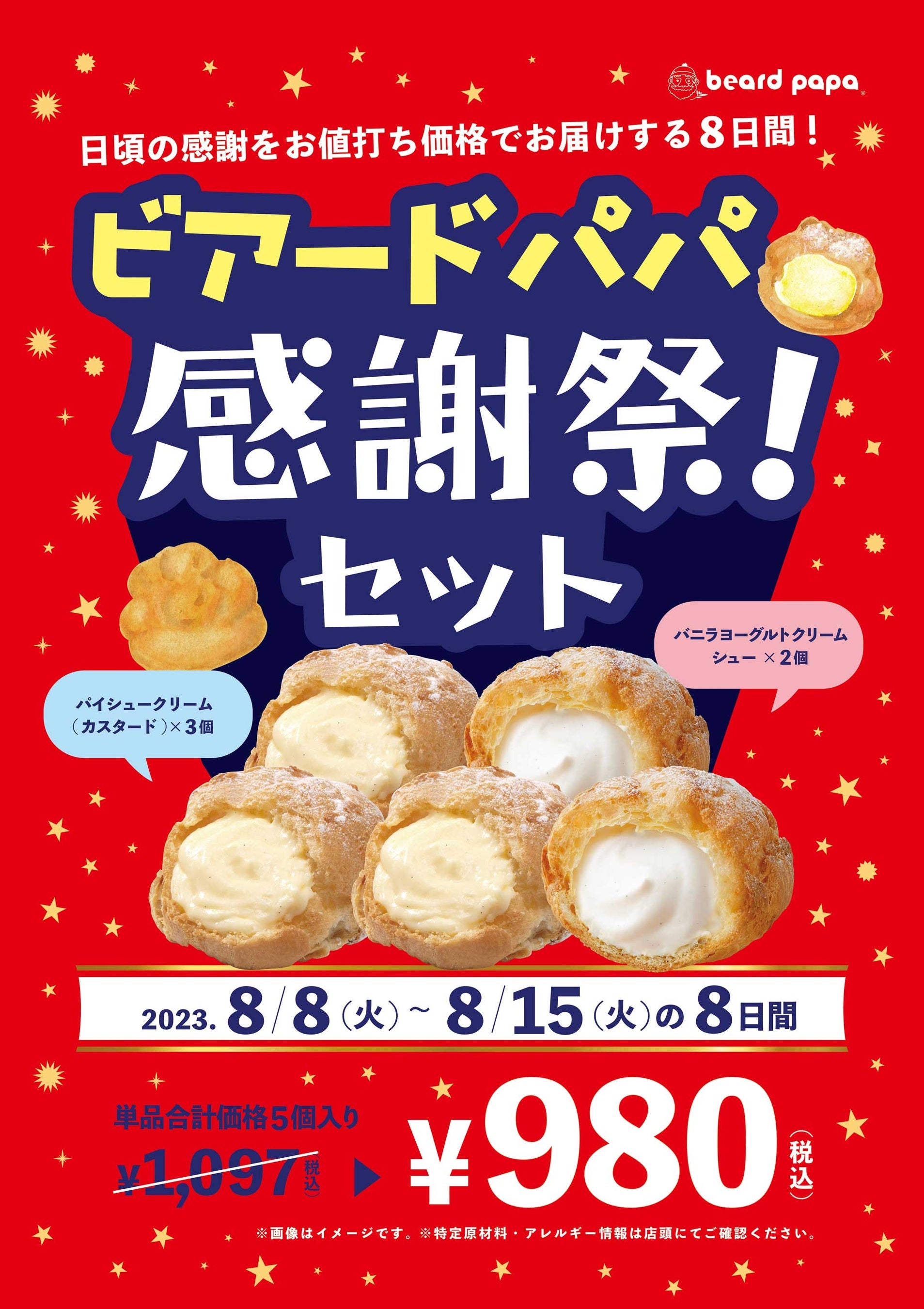 【8/8からの8日間】 日頃のご愛顧に感謝をこめて!年に一度の“ビアードパパ感謝祭!” 王道&人気のシュークリームセットを特別価格でご提供