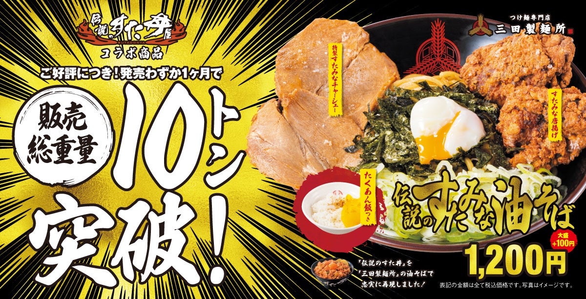 【速報】三田の油そば史上最速!三田製麺所×伝説のすた丼屋コラボメニュー『伝説のすたみな油そば』が販売からわずか1か月で販売総重量10トン(約1.2万食)突破!
