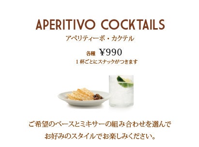 “アペリティーボ” は、ディナー前の夕刻から、食前酒と軽いフードを楽しむイタリアの食習慣ともいえるスタイル。イタリア人にとって “アペリティーボ” は「食前酒としてのカクテルだけでなく、ライフスタイルの1つであり、仲間や家族と楽しく過ごす時間そのもの」と言い、日常の暮らしの中にしっかりと根付いています。