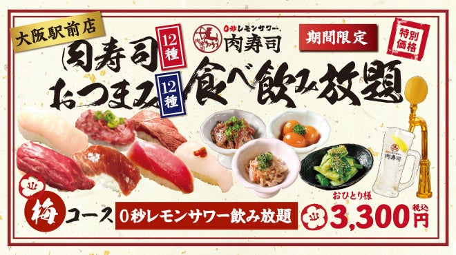 【梅コース】0秒レモンサワー付!肉寿司12種+おつまみ12種食べ飲み放題90分3,300円(税込)