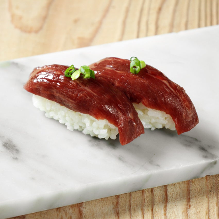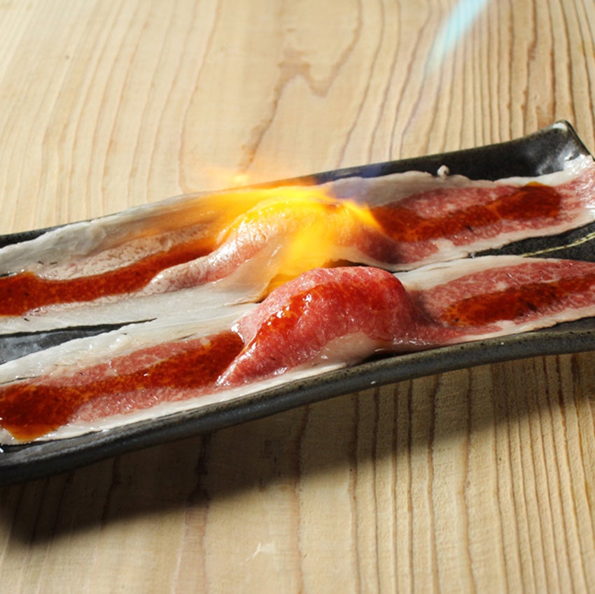 元祖「肉寿司」では、厳選された素材・安全性と食感や旨味の両立を追及した調理法・素材の旨味を引き立たせる調味料にこだわって、肉寿司を提供しています。特に生食での提供が難しい牛肉・豚肉などは、安全性を保ちながらも考え抜かれた加熱・調理方法で、旨味の流出を最小限に抑えつつ、お客様への生食に近い食感と風味、旨味が凝縮された肉寿司のご提供を実現いたしました。全国に28店舗展開しており、これからも多くのお客様にこだわりのつまった安全な肉寿司を提供して参ります。