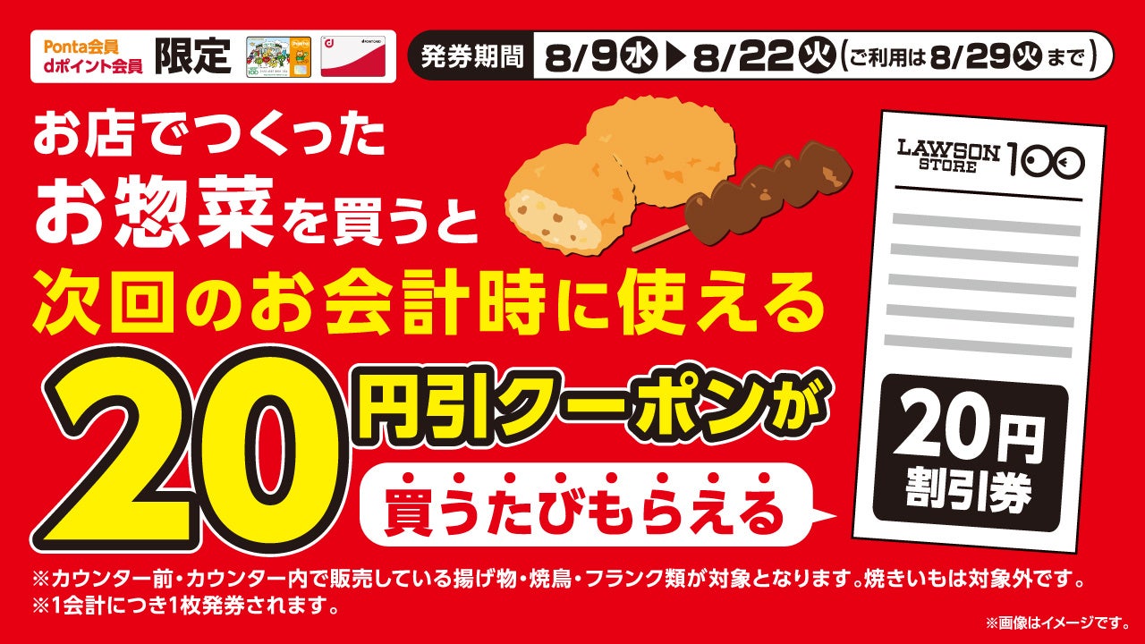発券条件:期間中、Pontaカードまたはdポイントカードをご提示の上、対象のホットスナックをご購入いただきますと、次回ホットスナック購入時にご利用いただける20円割引券を、1会計につき1枚進呈します。