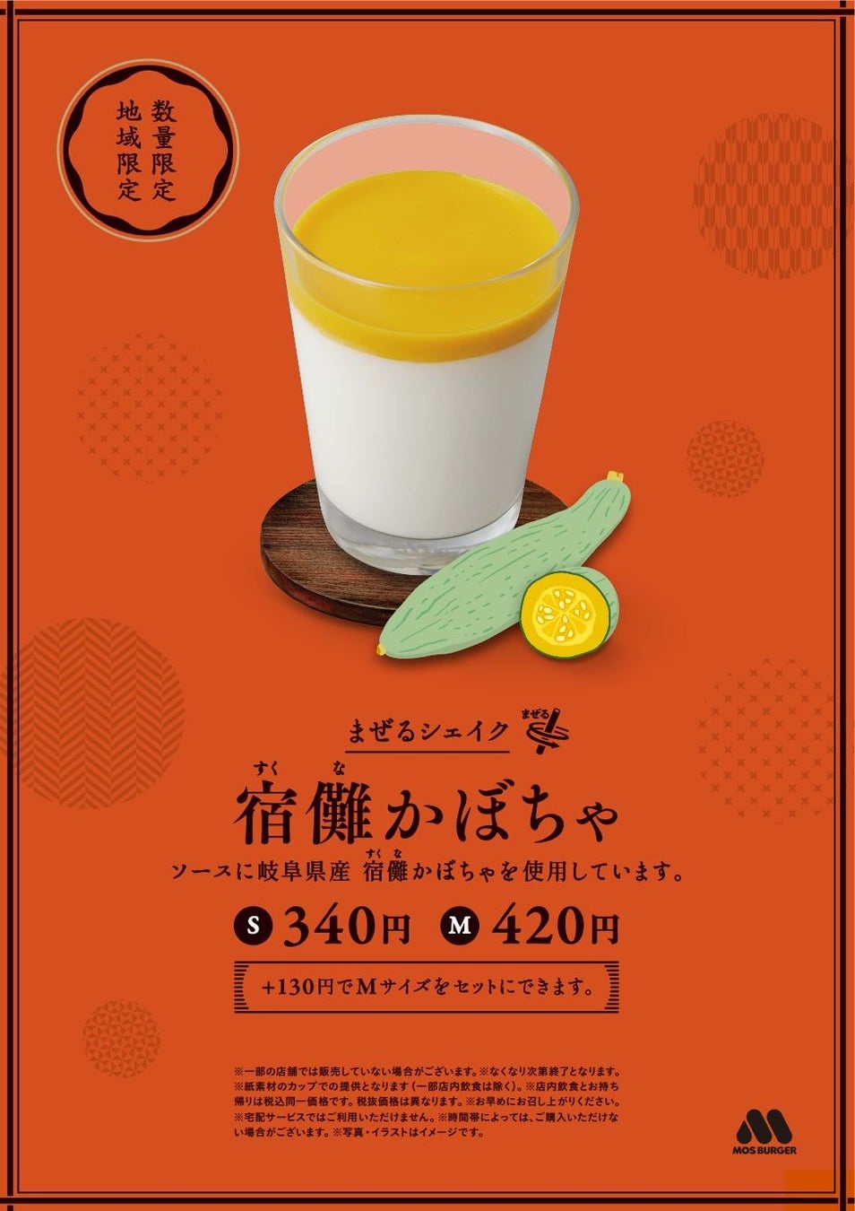 岐阜県産「宿儺かぼちゃ」を使用したソースに、「モスシェイク バニラ」を合わせた商品です。「宿儺かぼちゃ」の上品な甘さがバニラシェイクの美味しさを引き立てます。この地域だけの特別な秋の味覚を、シェイクを混ぜ合わせながらお楽しみください。各セット価格に130円プラスすると、セットメニューのドリンクとしてもお選びいただけます。