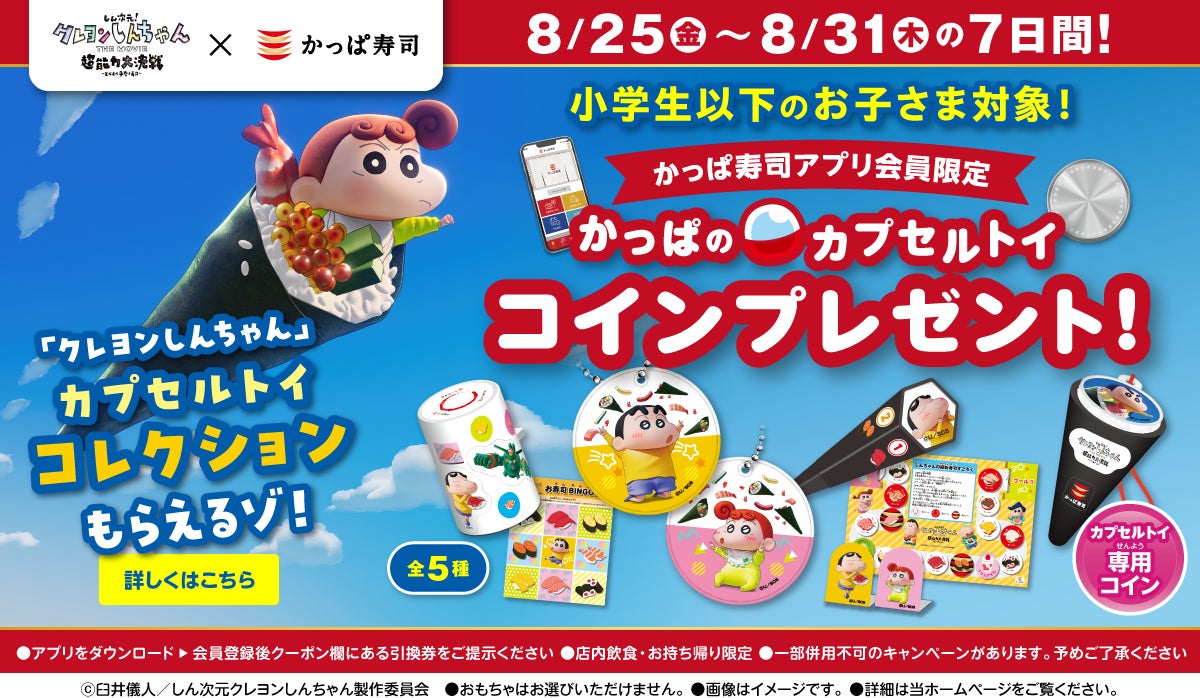 お寿司を食べて「しん次元!クレヨンしんちゃん」コラボアイテムをゲットしよう!【かっぱ寿司アプリ会員限定】「カプセルトイコイン」プレゼントキャンペーン