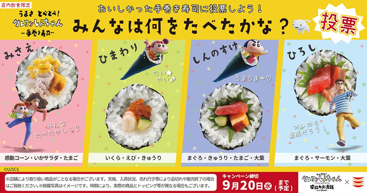 ・参加方法:かっぱ寿司公式Twitter(@kappasushi_jp)をフォロー後、うまさ とべとべ!クレヨンしんちゃん ~手巻き寿司~野原家のおすすめネタ4つからどのお寿司が美味しかったかを選択して投稿してください。