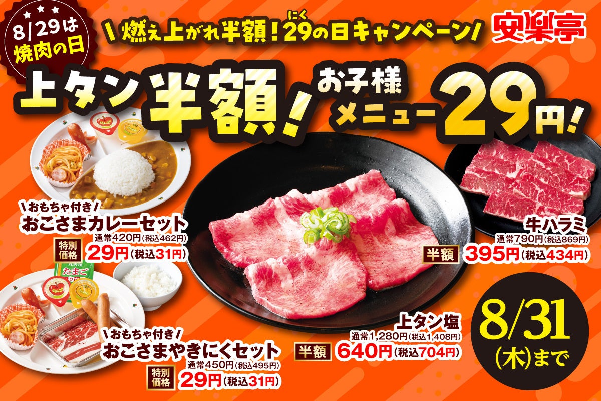 8月29日「焼肉の日」そして夏休みの最後に、美味しい焼肉をみなさんそろって楽しみませんか?美味しさ溢れる上タンや人気の牛ハラミが半額。加えてお子さまと一緒に気兼ねなくゆっくりお楽しみいただけるように、該当お子さまメニューを驚きの29円(税込31円)の特別価格でご提供します。