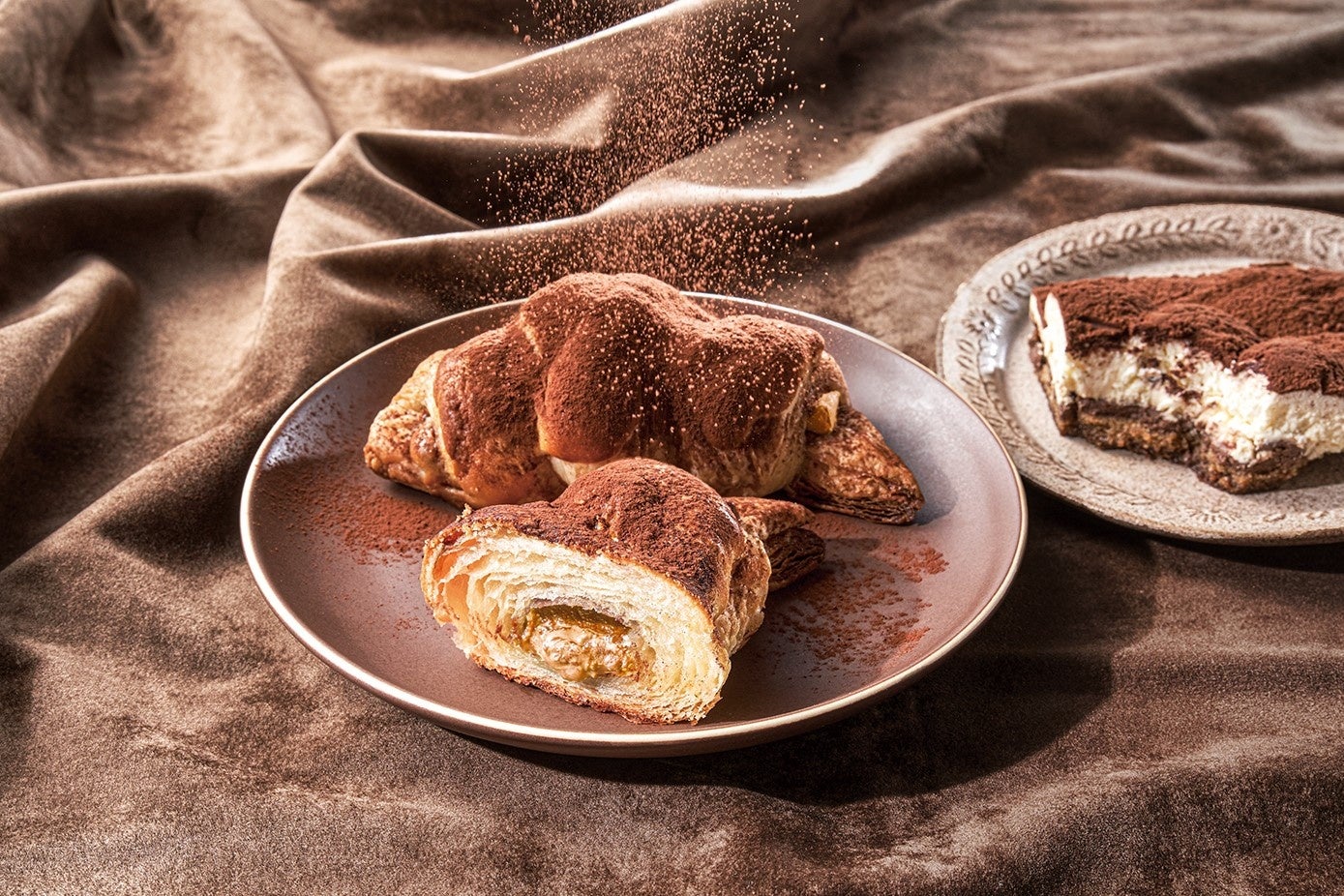 『プレミアムチョコクロ コーヒーティラミス』は、『チョコクロ』をちょっとリッチに進化させた『プレミアムチョコクロ』シリーズの限定商品です。コーヒーを使用したデザートである“ティラミス”をチョコクロで表現しました。本商品のために開発したコーヒー味のチョコレートをサクサクのクロワッサン生地で包み込み、香り高いコーヒーソースと、2種類のチーズを混ぜ合わせたクリームをトッピングし焼き上げました。仕上げにココアパウダーをたっぷりとかけ、味わいはもちろん、見た目もティラミスのような仕上がりです。