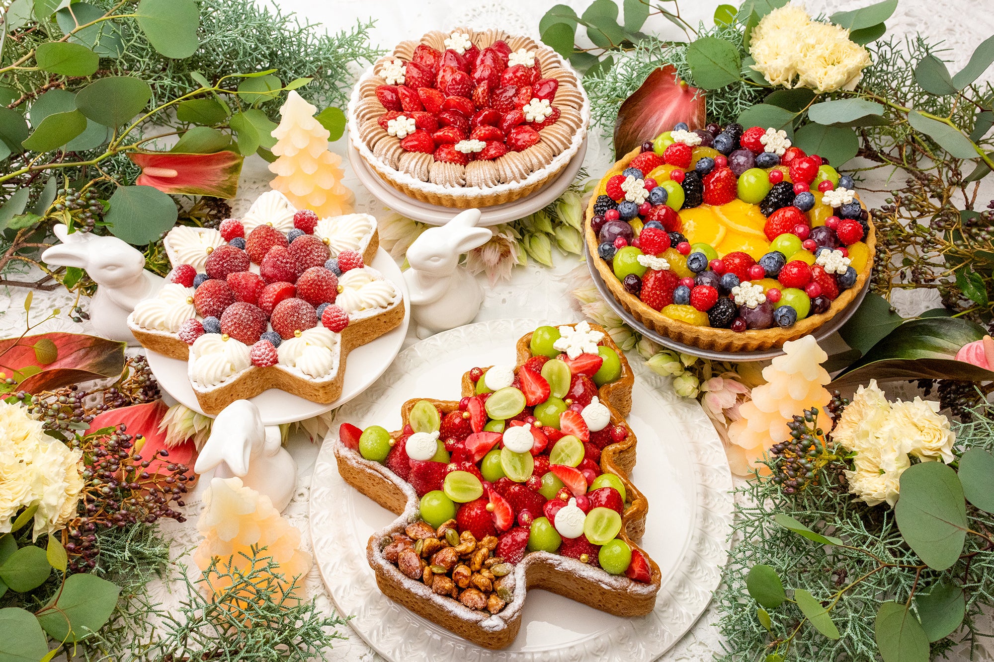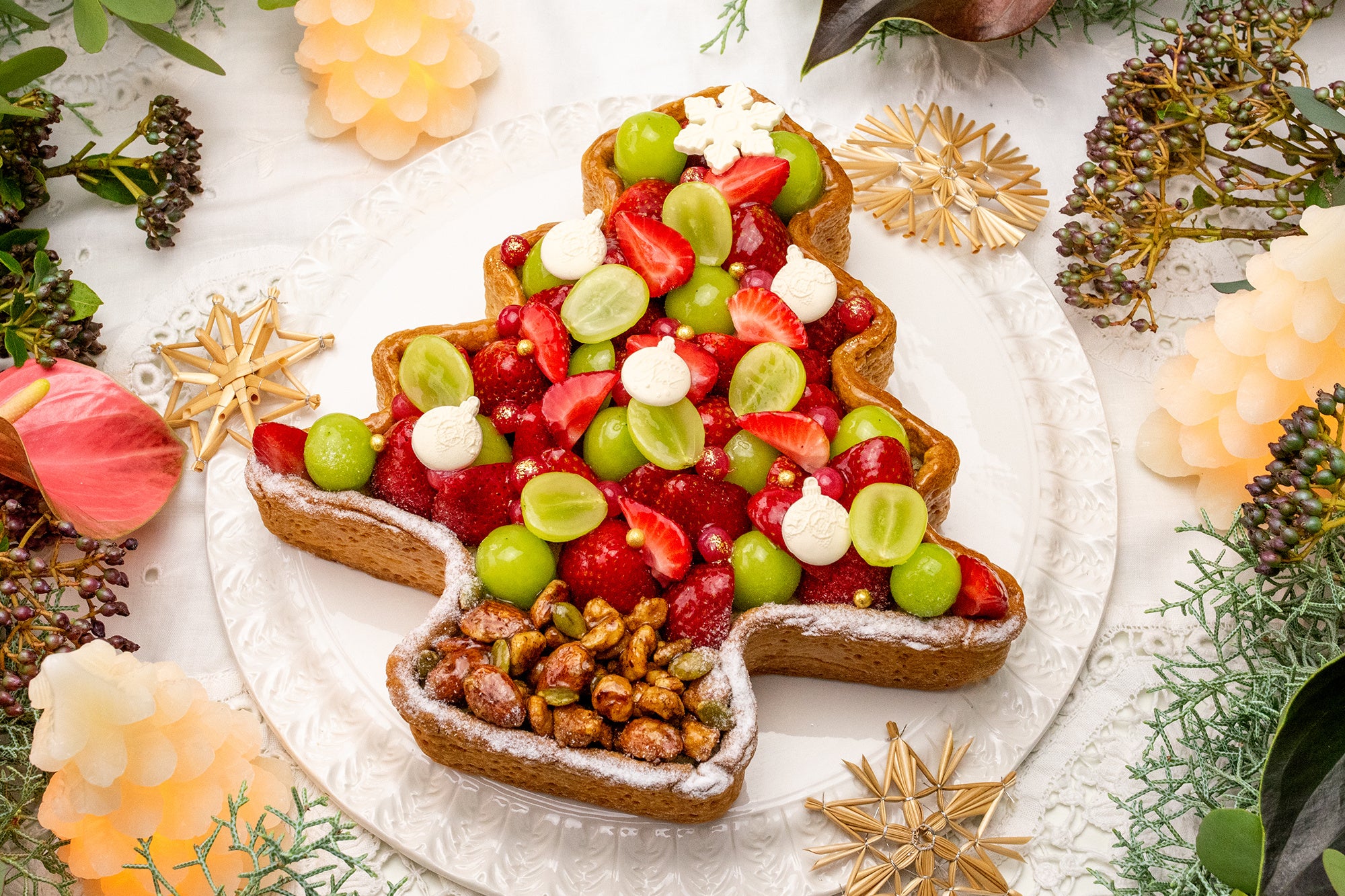 今年のクリスマスケーキは、フルーツをたっぷりと飾ったツリーやリースをイメージしたものをはじめ、真っ白なクリームと真っ赤なイチゴで彩った新作の星型のタルト、なめらかなチョコレートとイチゴのタルトなどクリスマスにぴったりな華やかな全4種類のケーキが揃いました。聖夜を盛り上げる1年に1度のスペシャルなケーキです。