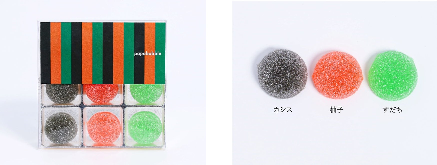 定式幕のパッケージに、萌黄/柿/黒のそれぞれのカラーをイメージした3種のグミでまとめました。さっぱりした酸味が強めのバブレッツです。