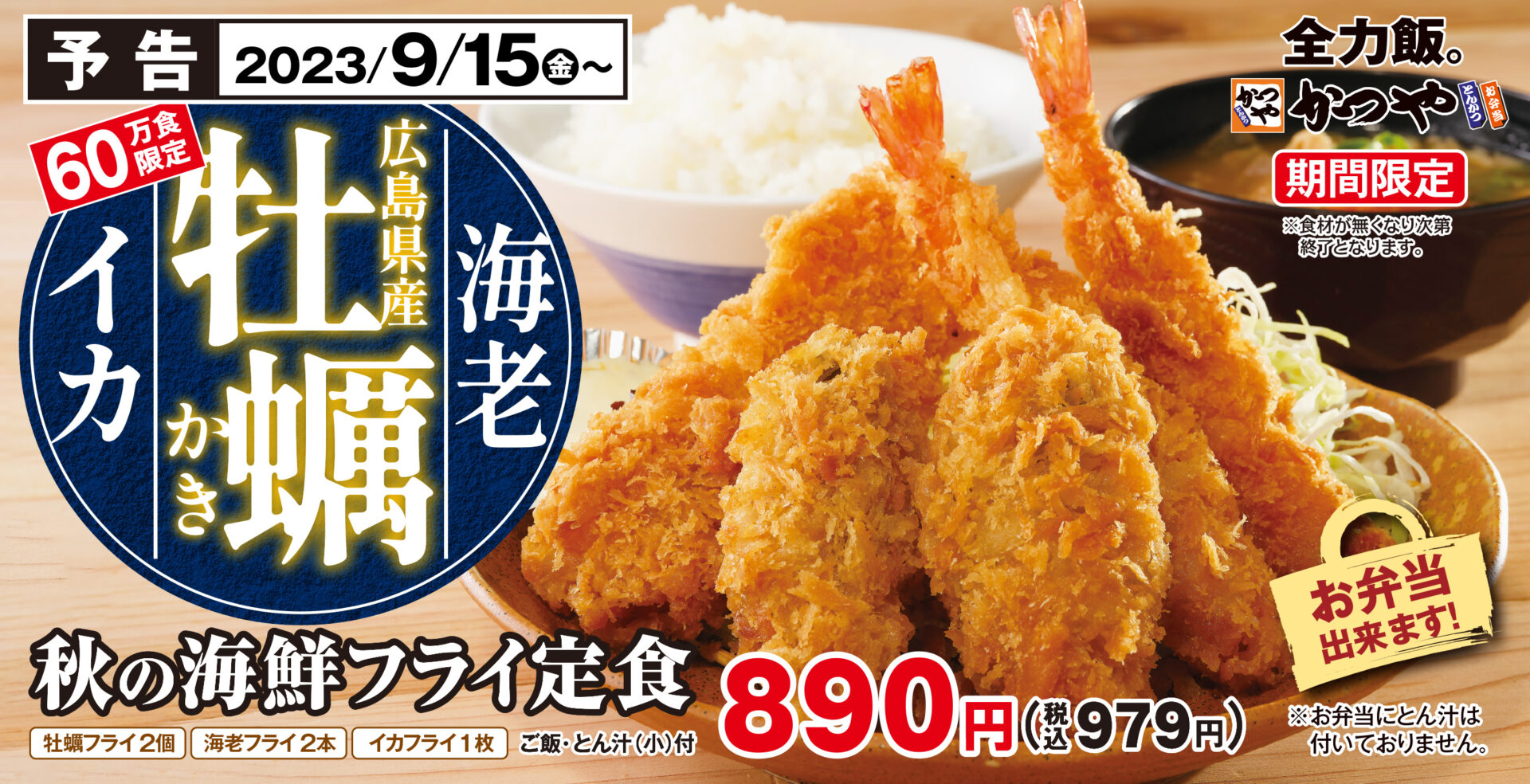 暦の上では秋ですが、2023年は残暑が厳しくあります。そんな中でも、秋の海鮮を代表する「広島県産 牡蠣フライ」をはじめ、海老フライとイカフライを一皿に盛り合わせた「秋の海鮮フライ定食」を2023年9月15日(金)より、とんかつ専門店「かつや」にて60万食限定で販売を開始いたします。