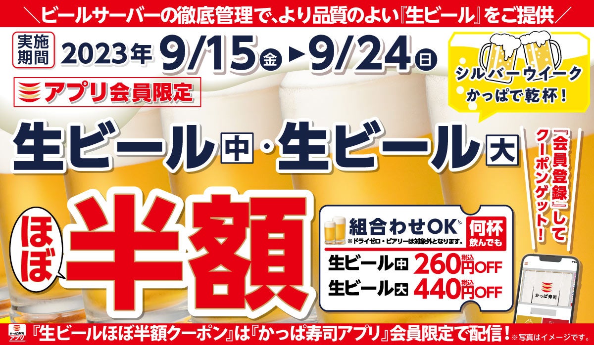 【かっぱ寿司アプリ会員限定】秋も美味しい生ビールがほぼ半額の10日間 さまざまな秋に乾杯!何杯飲んでも「生ビールほぼ半額キャンペーン」