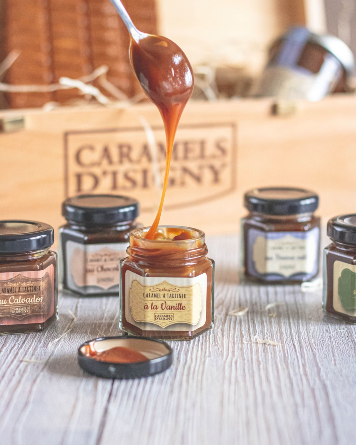 イズニーキャラメルでは、キャラメルはもちろん、トーストやクレープにもお勧めのキャラメルソースや、塩バター、バニラ、チョコレート、ノワゼット、カルバドスの5種のフレーバーがセットになったキャラメルクリームなどもご用意しています。キャラメルだからこその幸福感をお試しください。