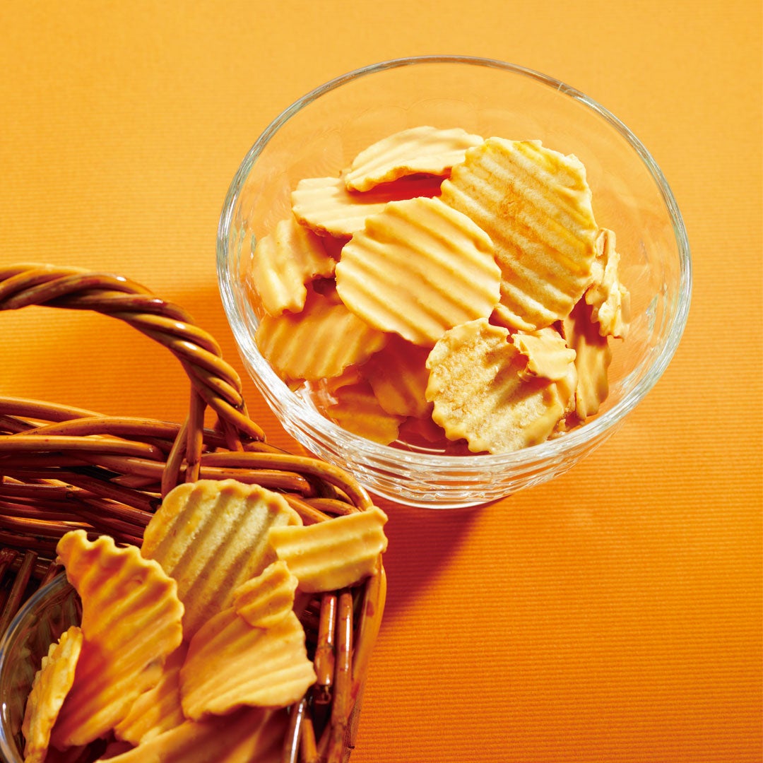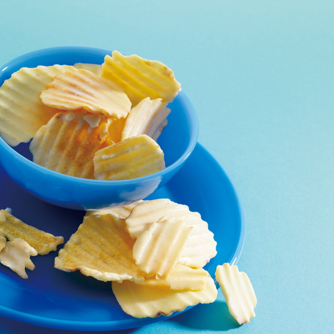 ポテトチップの片面に、チーズの風味がほんのり香るホワイトチョコレートをかけました。