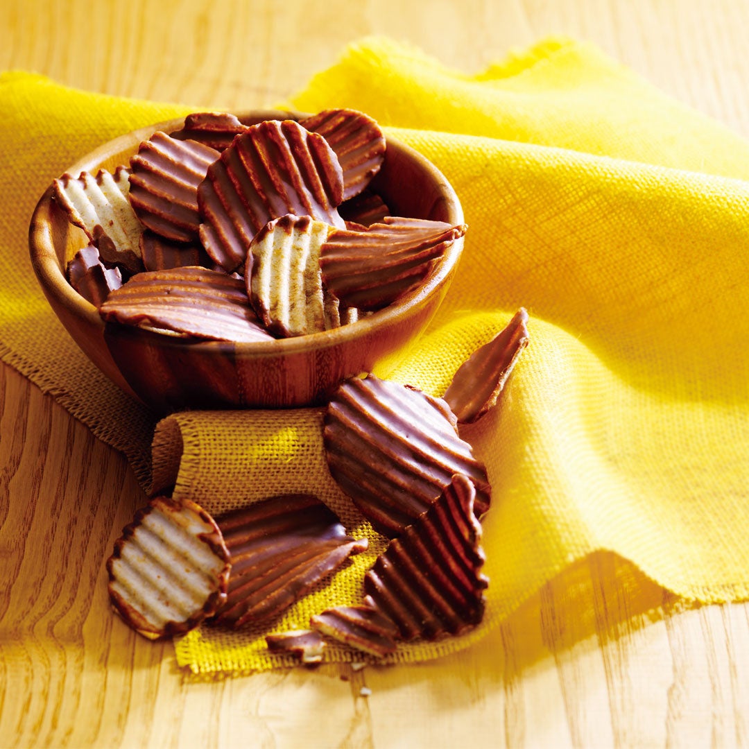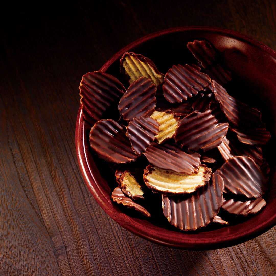 ポテトチップの片面に、カカオの香り豊かな甘さ控えめのチョコレートをコーティングしました。