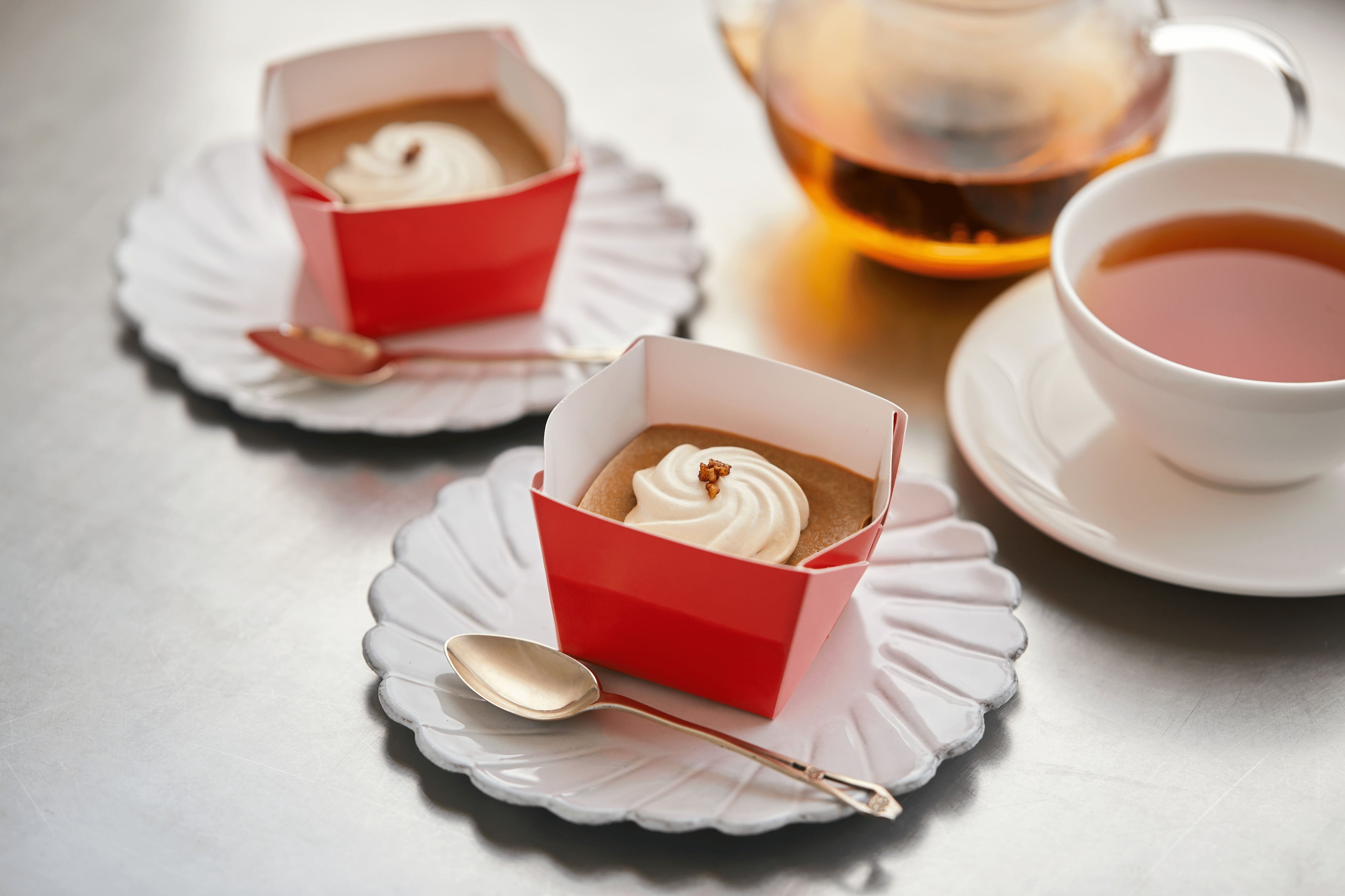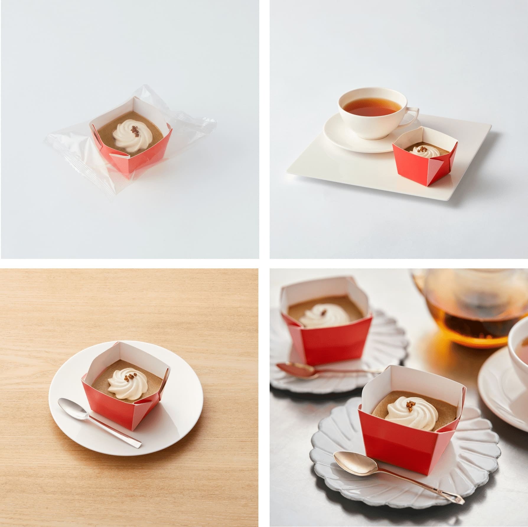 動物性原材料不使用。簡単便利なカップ入りデザート。豆乳原料にアールグレイの茶葉を混ぜ込んで作ったムースにアールグレイ風味のゼリー、クリームをトッピング。米粉とアーモンドで作ったクランブルが食感のアクセントになっています。