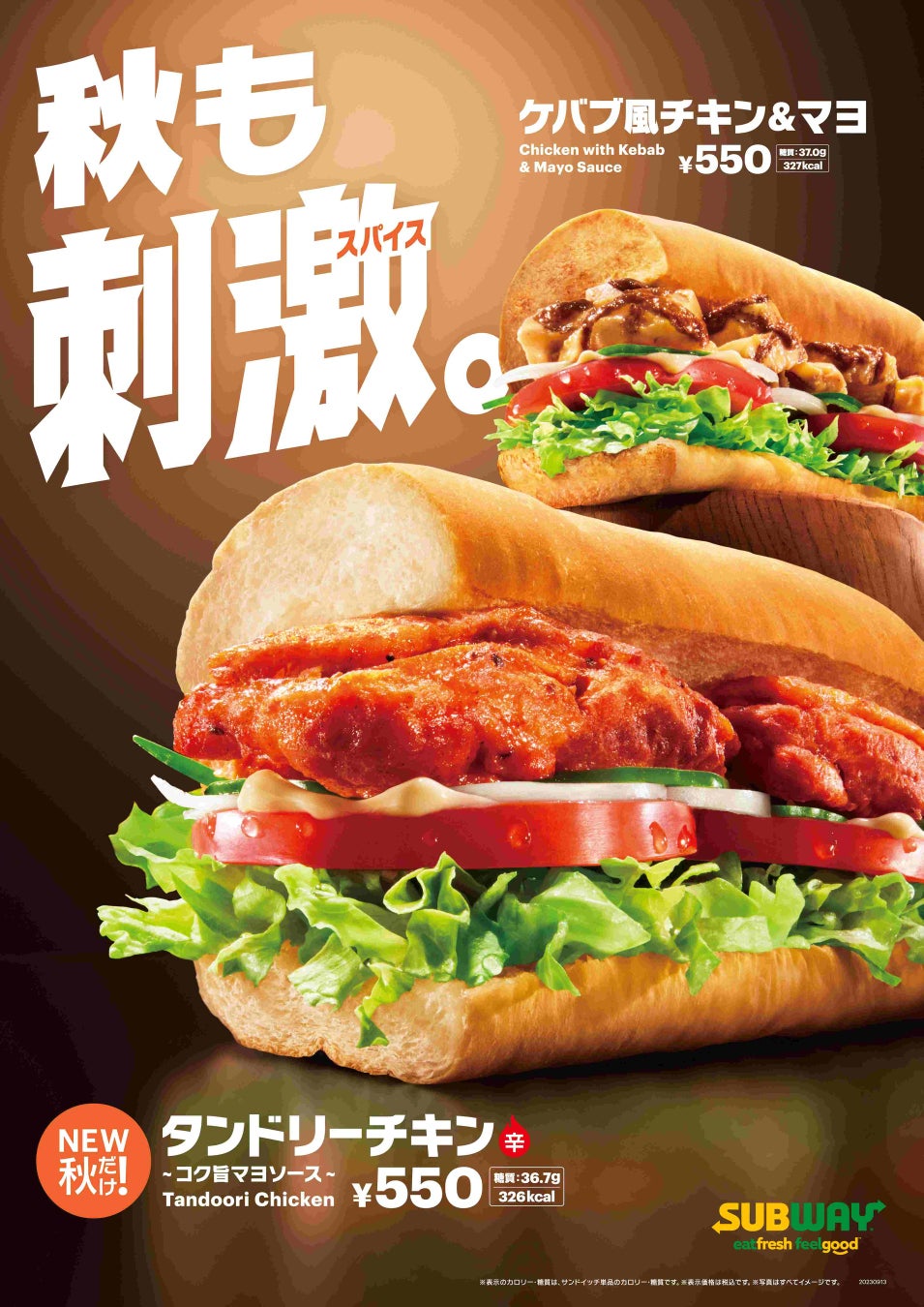 サブウェイのスパイシー代表格が2年ぶりに復活!大人気サンド「タンドリーチキン」で秋も刺激的に〜「タンドリーチキン~コク旨マヨソース~ 」「ケバブ風チキン&マヨ」2023年9月13日(水)より販売開始〜