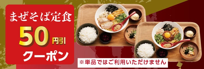 宮本むなし公式アプリでは「まぜそば定食各種50円引き」クーポンを配信いたします。