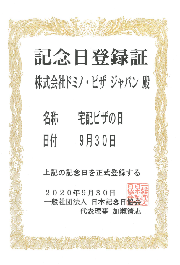 ドミノ・ピザが日本で事業をスタートさせて35周年にあたる2020年に、ドミノ・ピザ ジャパンの創業記念日であり、日本で初めて「宅配ピザ」というサービスがはじまった日でもある9月30日を「宅配ピザの日」と定め、(一社)日本記念日協会に認定・登録されました。