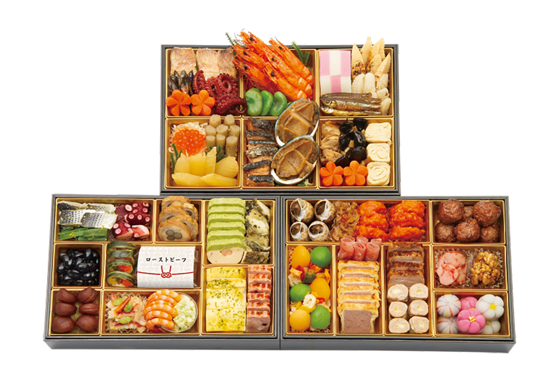 食の贅沢を充分に堪能いただける風味自慢のおせち料理です。全国の割烹料亭や高級ホテルのベテラン料理人からのお墨付き銘菜を,和洋中バランスよく三段重に盛付けました。